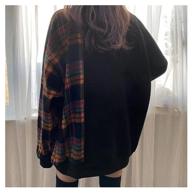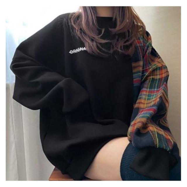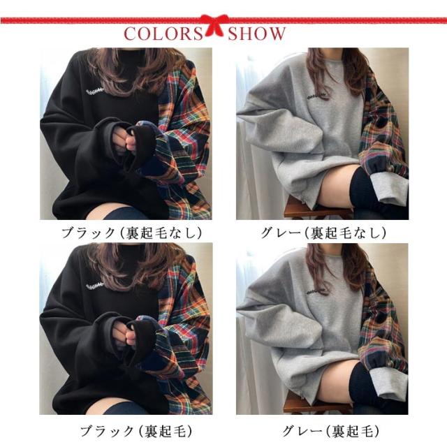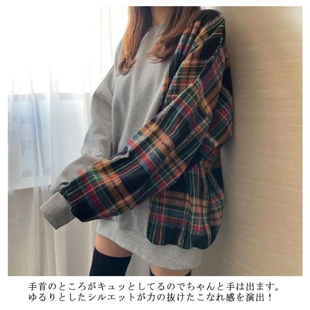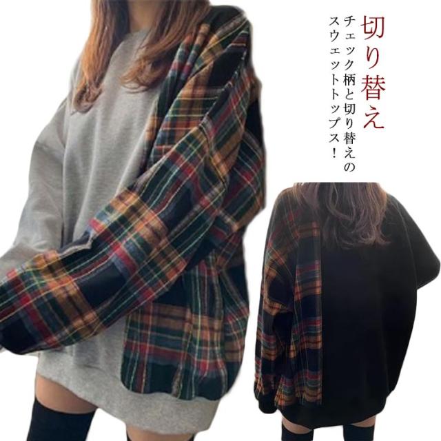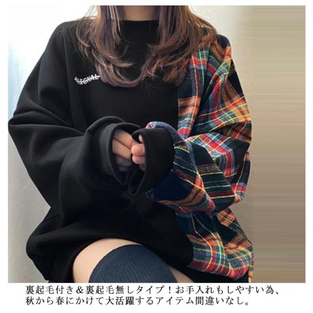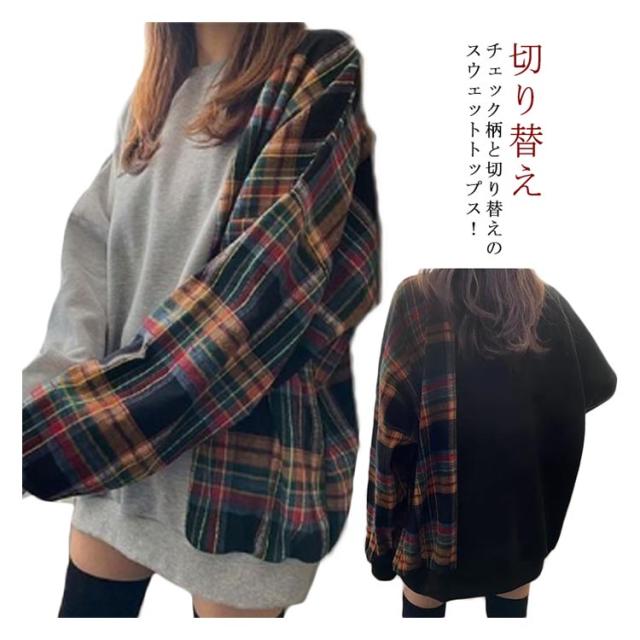 パーカー レディース 長袖 切り替え トレーナー 異素材 チェック柄 トップス プルオーバー tシャツ フードなし ゆったり オーバーサイズ チェック柄 切り替え 裏起毛あり 裏起毛なし 体型カバー‘春秋冬