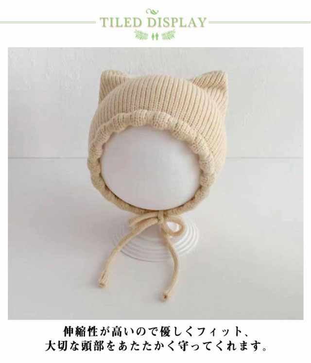 | あったかくて可愛い、ベビー・キッズ用ニット帽。 どんな服装にも合わせやすい、耳付きニット帽です。 これ1つで、あっという間におしゃれ感アップ! 耳まで被せられるので寒い日にもオススメです。 紐付きなので途中で脱げる心配もありません。 伸縮性が高いので優しくフィット、大切な頭部をあたたかく守ってくれます。 厚すぎず、薄すぎず、ちょうどよい生地の厚さで、使いやすいニット帽です。 | |