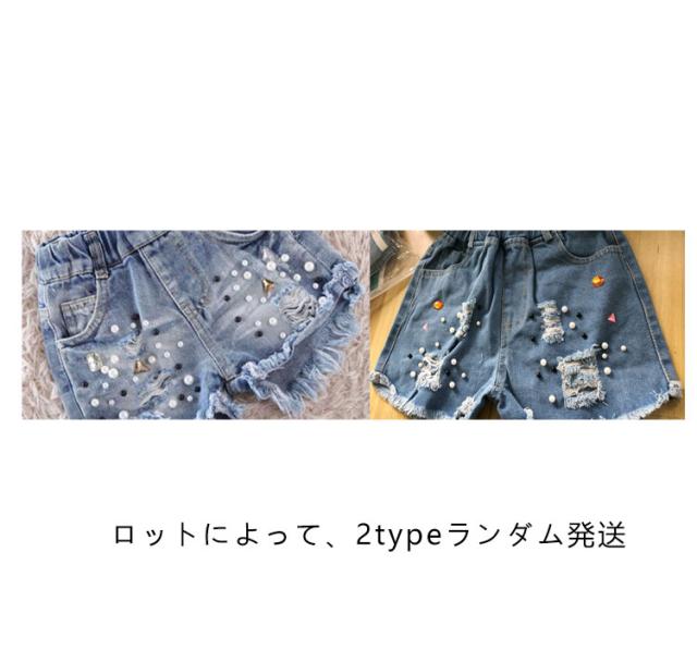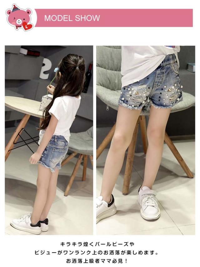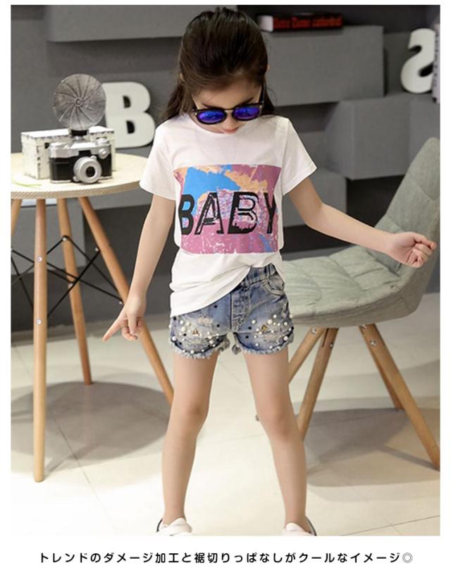 お洒落上級者に! デニムパンツ デニムショートパンツ ショートパンツ ビジュー付き パールビーズ 女の子 キッズ ジュニア ダメージ加工 クラッシュ加工 ウォッシュ加工 ハーフパンツ デニム ジーンズ お洒落 ファッション