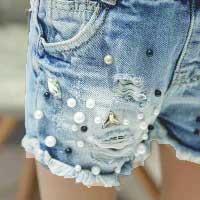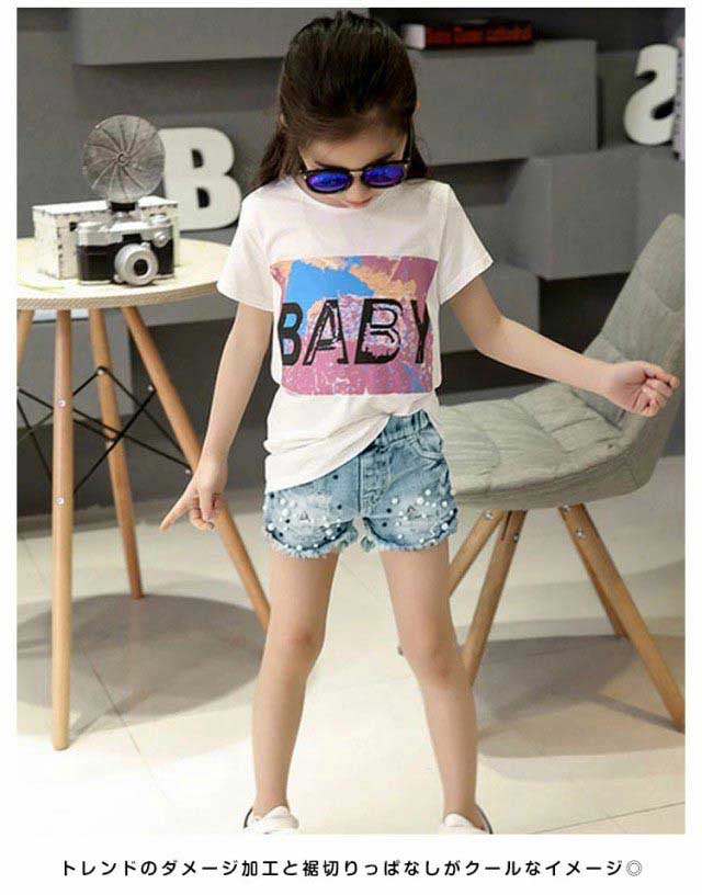 お洒落上級者に! デニムパンツ デニムショートパンツ ショートパンツ ビジュー付き パールビーズ 女の子 キッズ ジュニア ダメージ加工 クラッシュ加工 ウォッシュ加工 ハーフパンツ デニム ジーンズ お洒落 ファッション