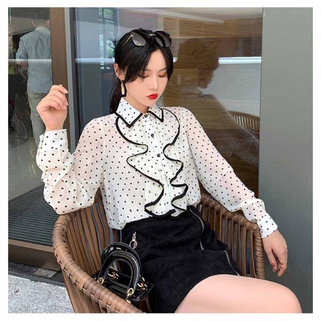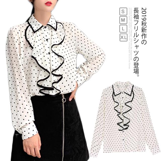 《送料無料》2019秋新作 フリルドット柄ブラウス ドット柄ブラウス フリルシャツ レディース シャツ ブラウス 長袖 ドット柄 水玉柄 フリル 通勤 エレガント シフォン