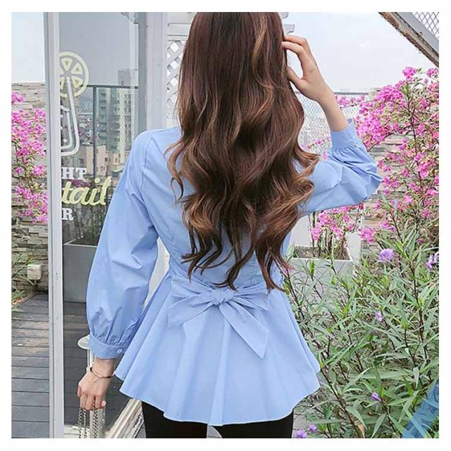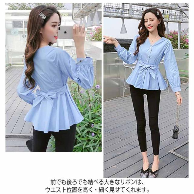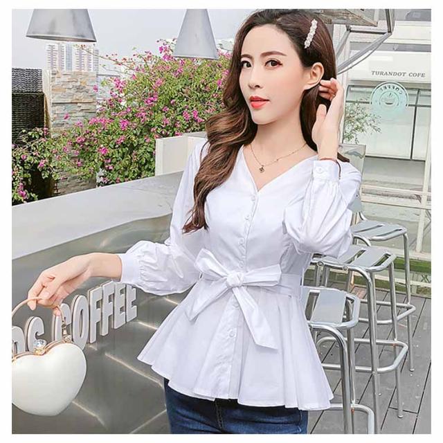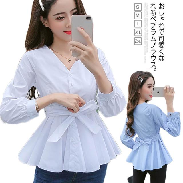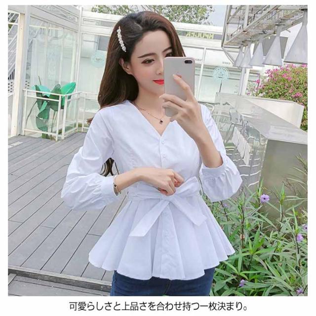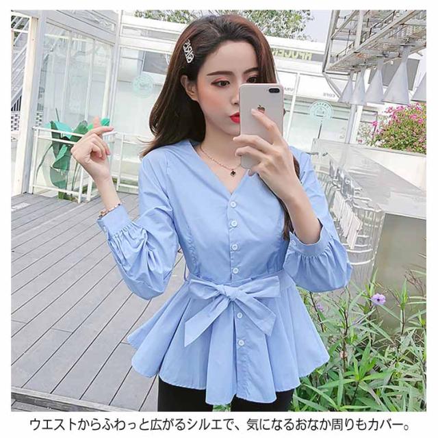 《送料無料》ウエストリボンベルト付きがアクセント!Vネックトップス レディース ブラウス シャツ トップス Vネック フリルブラウス 長袖 リボン Aライン フリル 無地 春 春服