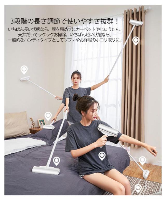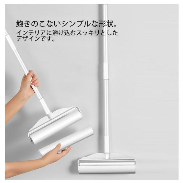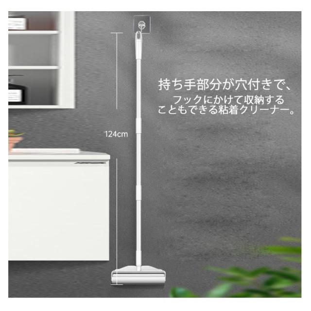 | カーペットから洋服のホコリまで、気になった時にササッと簡単にお掃除できる粘着クリーナー。 3段階の長さ調節で使いやすさ抜群! いちばん長い状態なら、腰を屈めずにカーペットやじゅうたん、天井だってラクラクお掃除。いちばん短い状態なら、一般的なハンディタイプとしてソファやお洋服のホコリ取りに。 ペットの抜け毛やほこり、髪の毛、糸くずなどのゴミがどんどん取れます。 専用替え用テープ5巻入! 持ち手部分が穴付きで、フックにかけて収納することもできる粘着クリーナー。 飽きのこないシンプルな形状。インテリアに溶け込むスッキリとしたデザインです。 | |