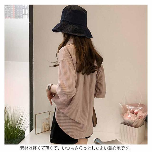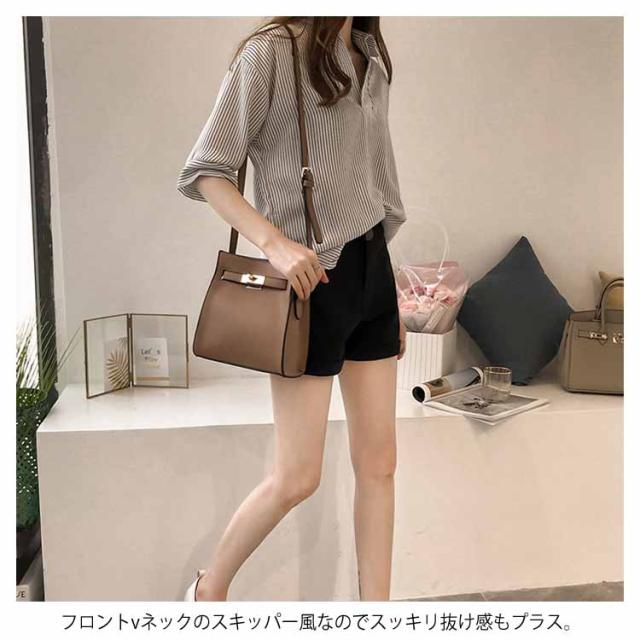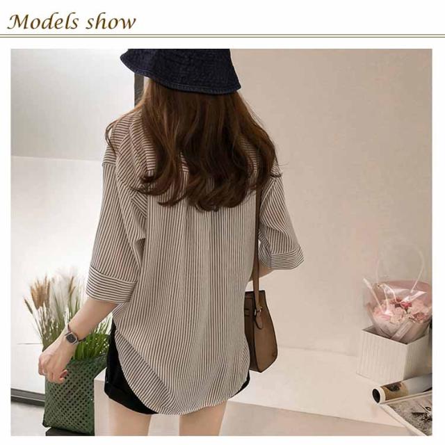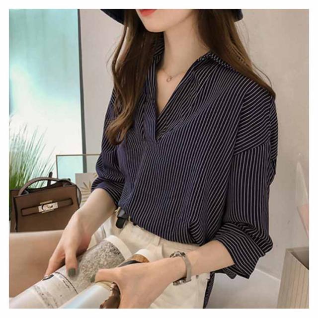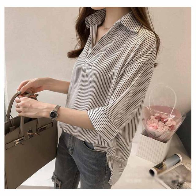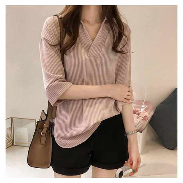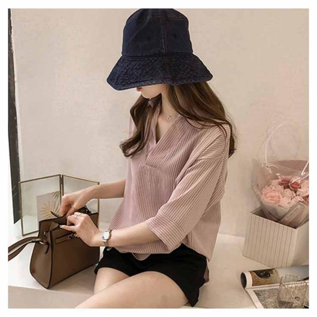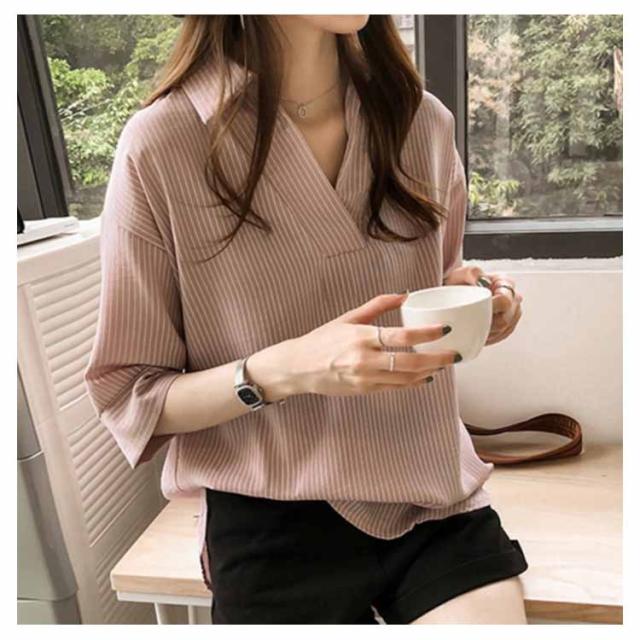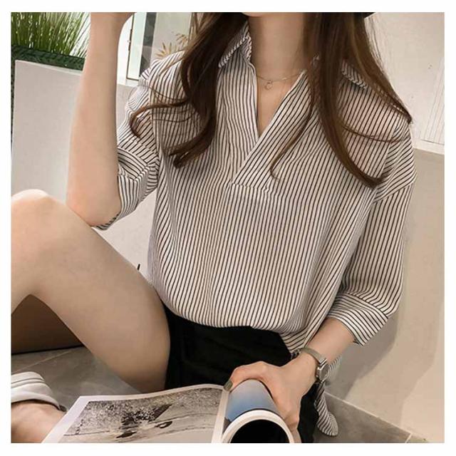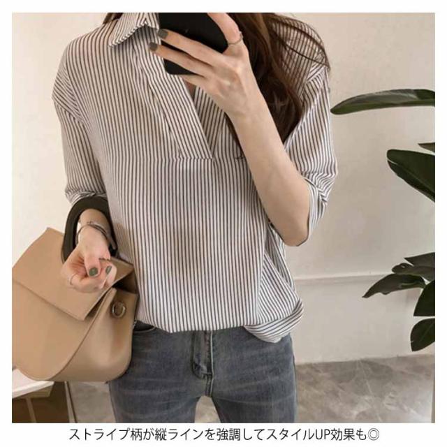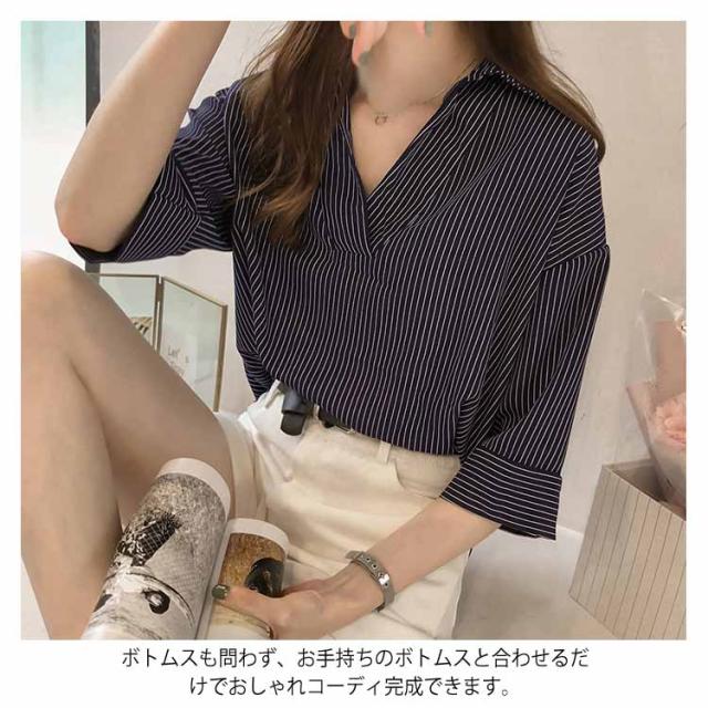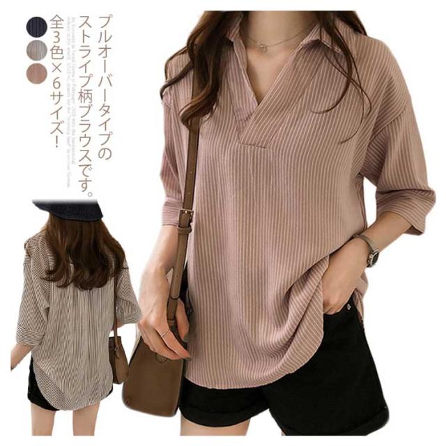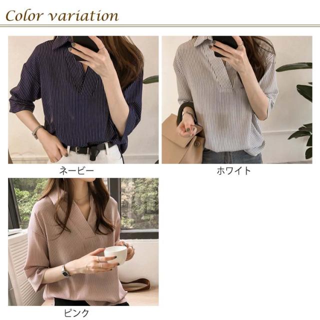 全3色×6サイズ!シャツ ブラウス Vネック ストライプ 七分袖 襟付き チュニック スキッパー Vネック レディース トップス