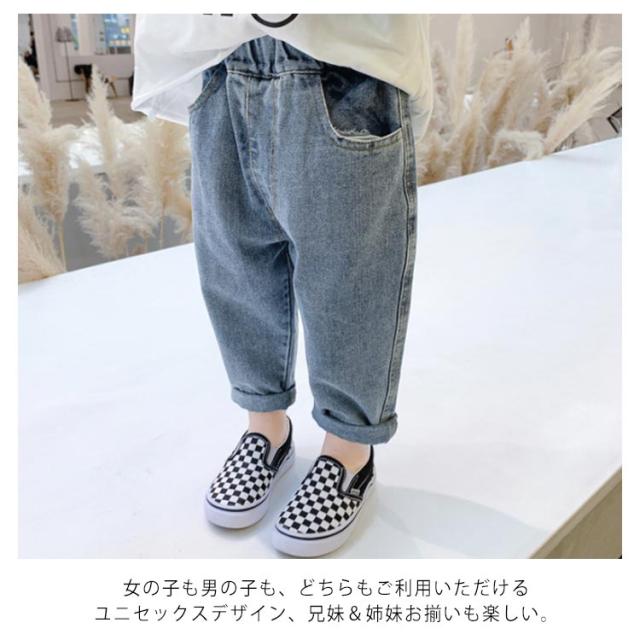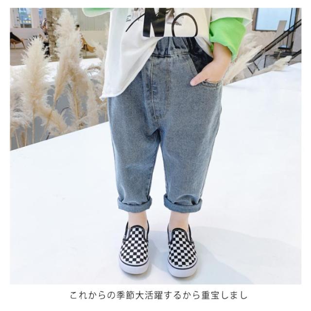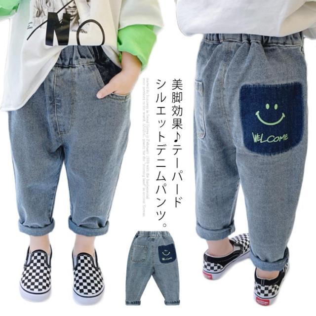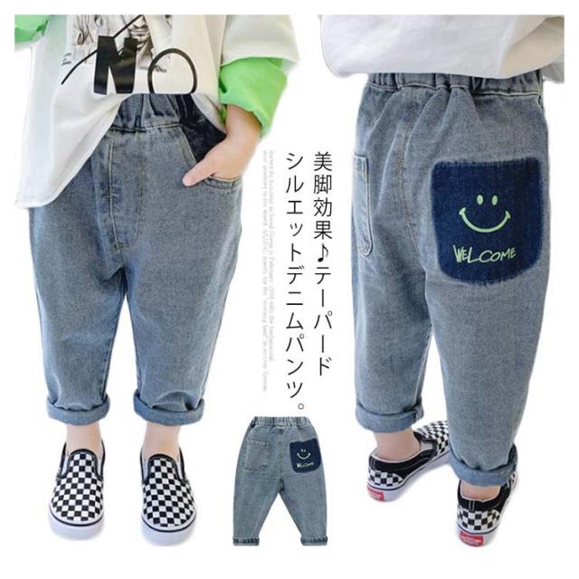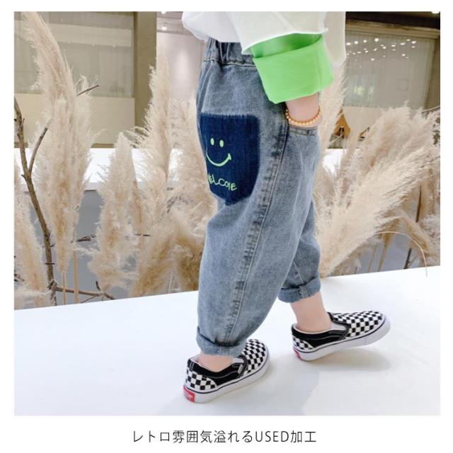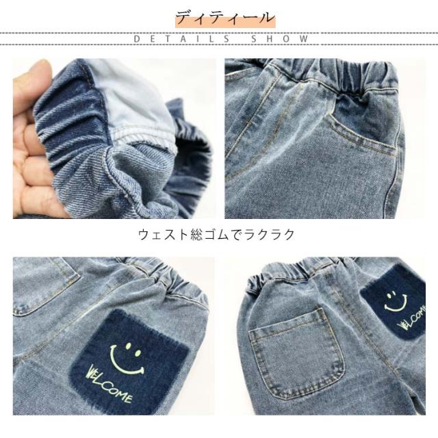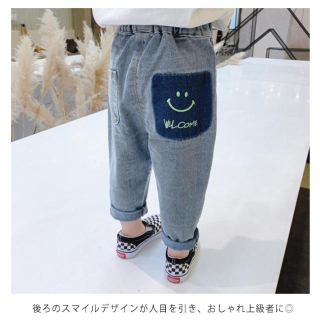 子供 デニムパンツ デニム ロングパンツ ユーズド加工 ウォッシュ加工 スマイル 可愛い ルーズフィット 長ズボン サルエル ウェストゴム キッズ 100cm 110cm 120cm 130cm 140cm