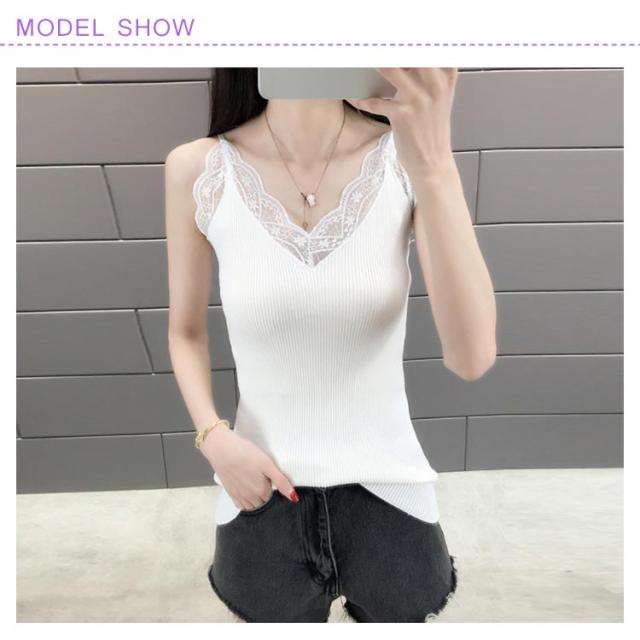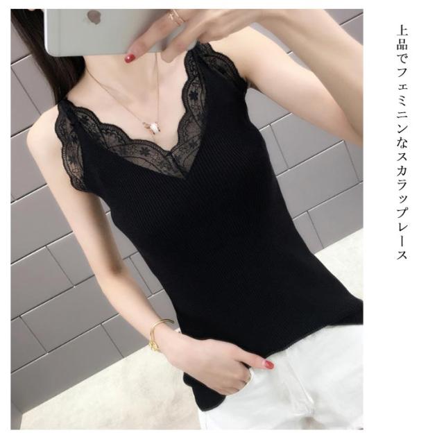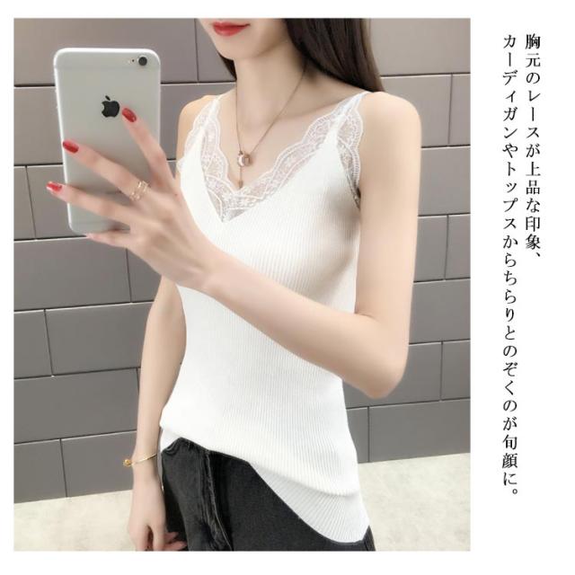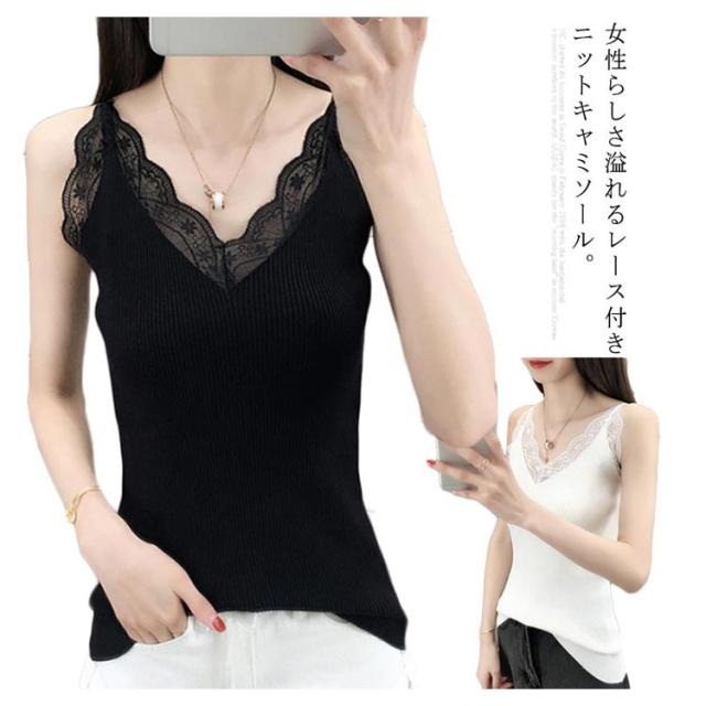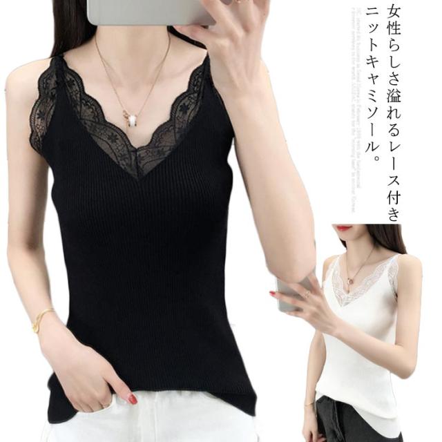キャミソール ニットキャミソール レース サマーニット レディース ノースリーブ トップス 無地 おしゃれ 大人 フェミニン タイト 伸縮性 リブニット