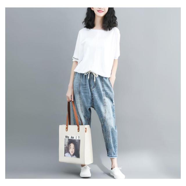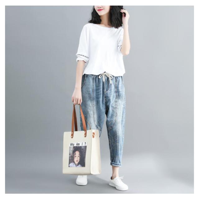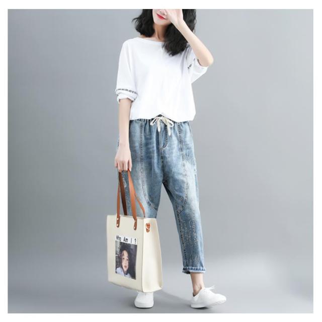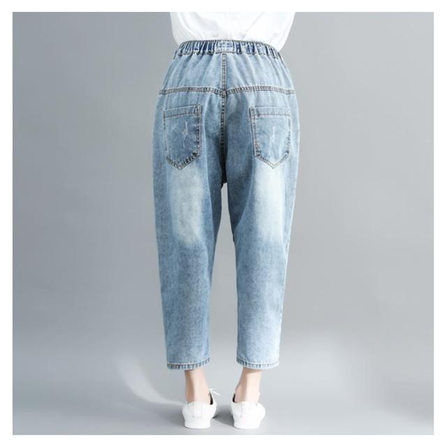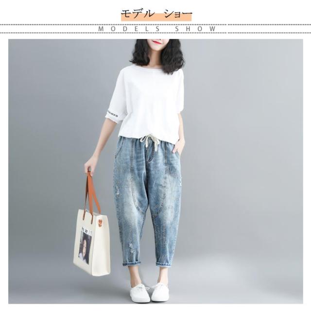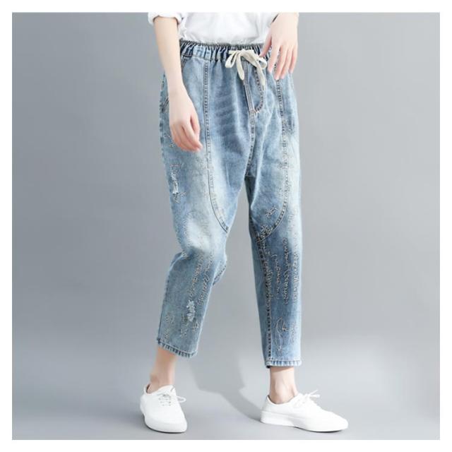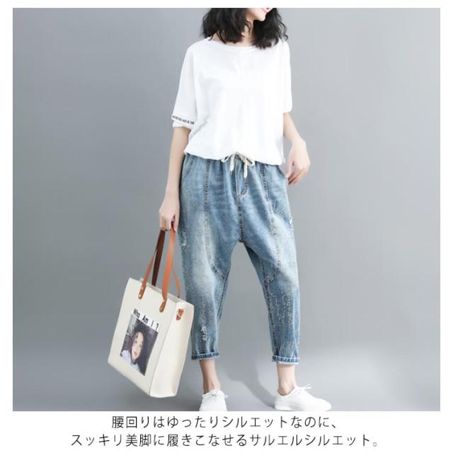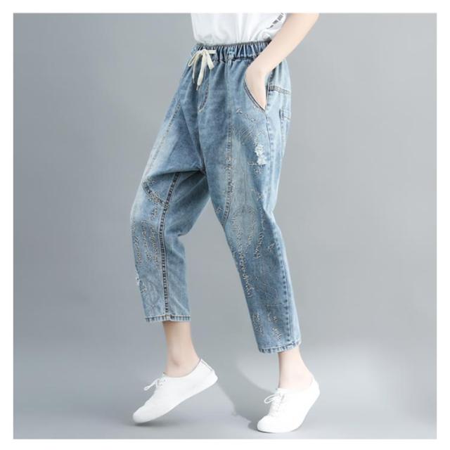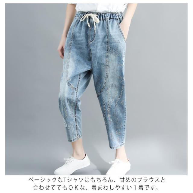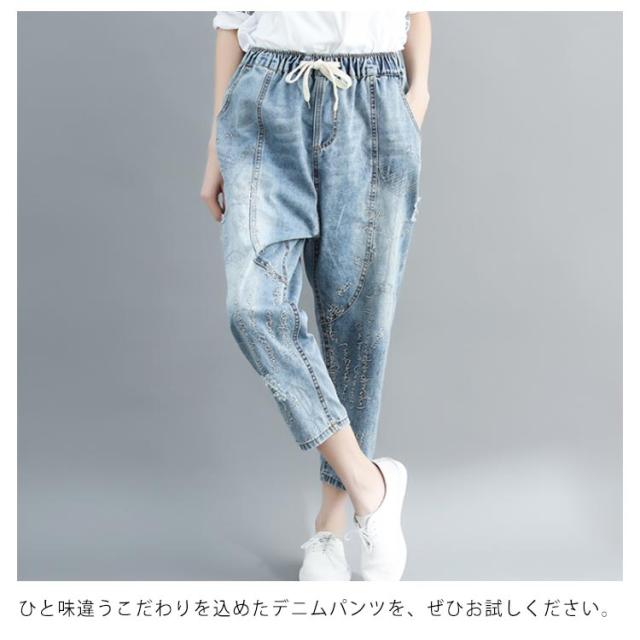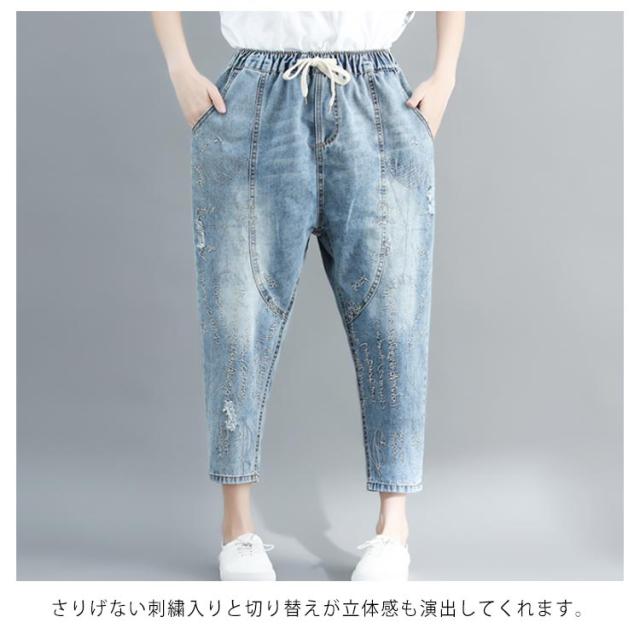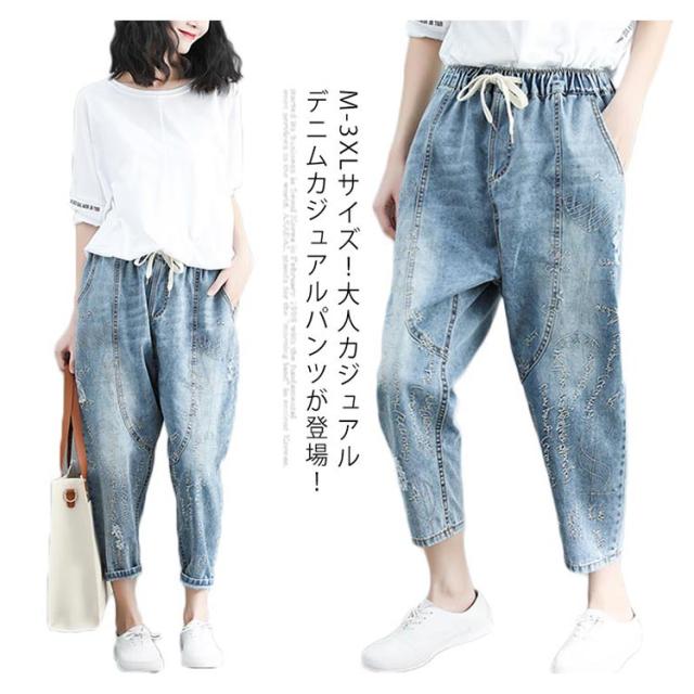 M-3XLサイズ!デニムカジュアルパンツ 刺繍パンツ デニムパンツ レディース サルエルパンツ クロップドパンツ サルエル ゆるパンツ ウエストゴム 刺繍入り ダメージ加工 春 夏