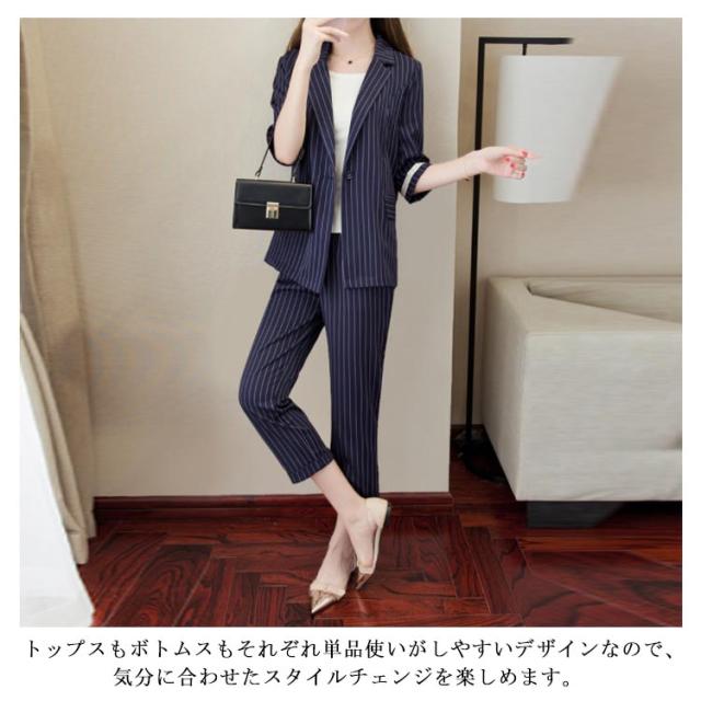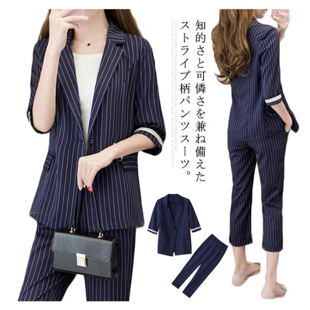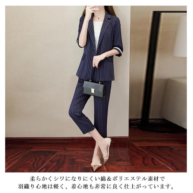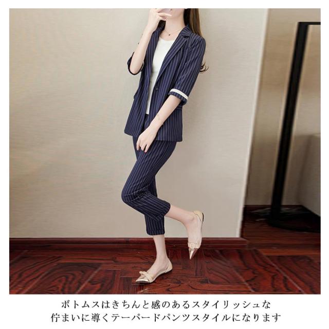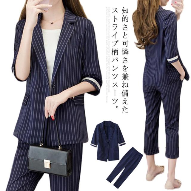 ストライプ柄 スーツ レディース パンツスーツ パンツドレス レディーススーツ セットアップ 上下セット 2点セット ママ 面接 リクルート 事務服 卒業式 入学式 結婚式 セレモニー フォーマル 通勤 OL 七分袖