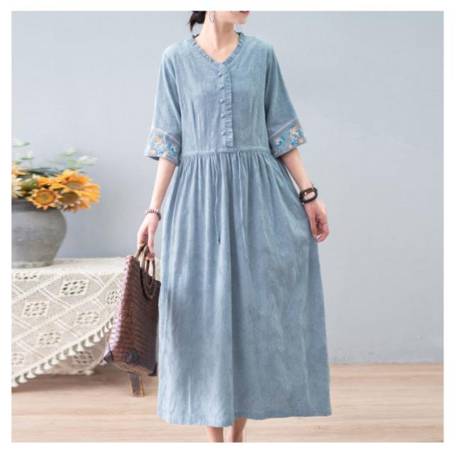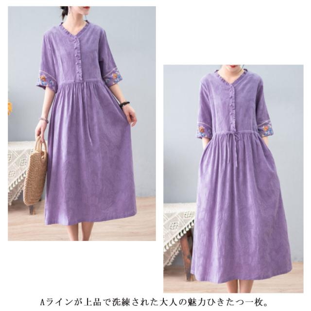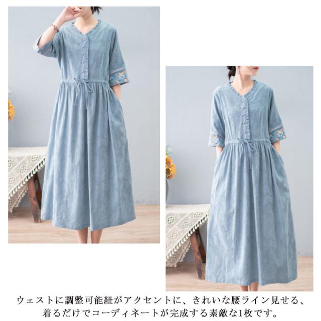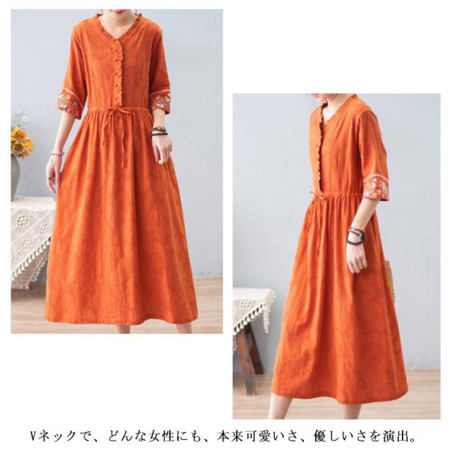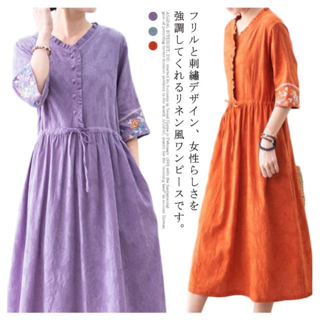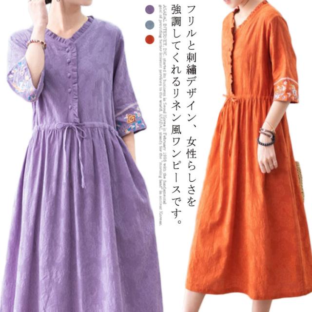 リネン風 ワンピース ロングワンピース Vネック 春夏ワンピース 綿麻ワンピース 涼しい 刺? フリル 体型カバー ナチュラル フェミニン かわいい M L XL 2XL 3XL