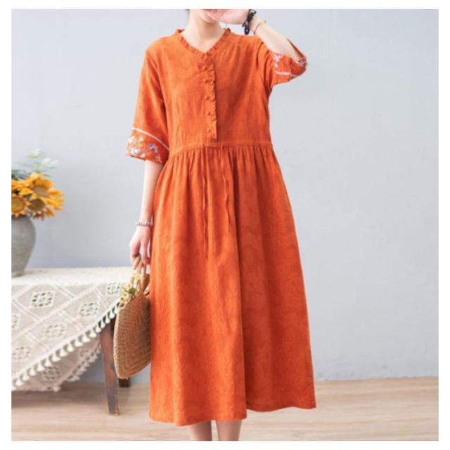 | フリルと刺?デザイン、女性らしさを強調してくれるリネン風ワンピースです。 ウェストに調整可能紐がアクセントに、きれいな腰ライン見せる、着るだけでコーディネートが完成する素敵な1枚です。 Aラインが上品で洗練された大人の魅力ひきたつ一枚。 使いやすい、柔らかい生地だから着心地よく、オーバーサイズだから体のラインが隠せて体型カバーもバッチリです。 Vネックで、どんな女性にも、本来可愛いさ、優しいさを演出。 | |