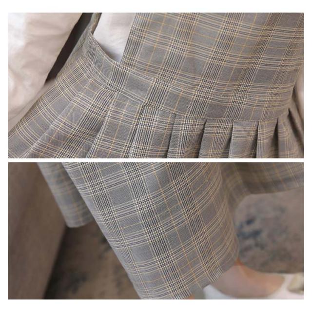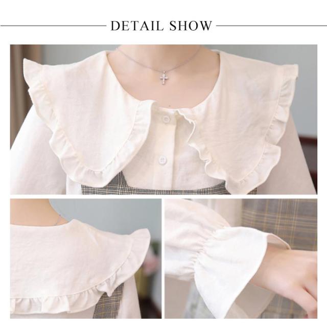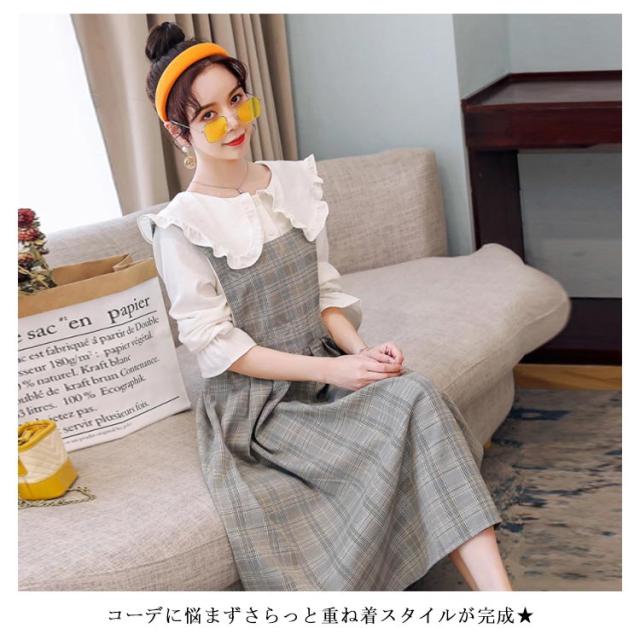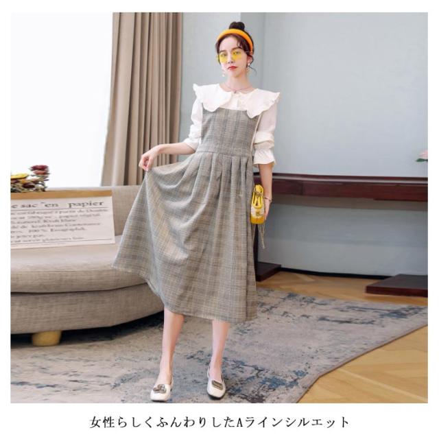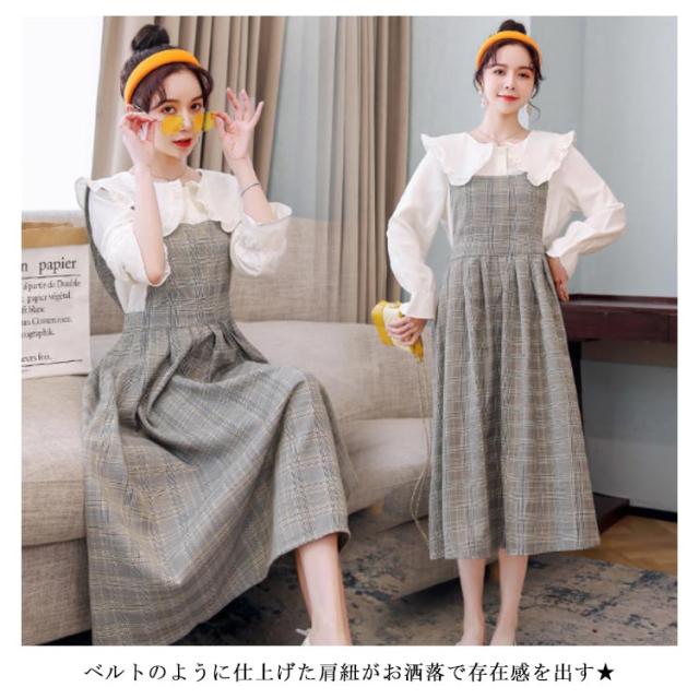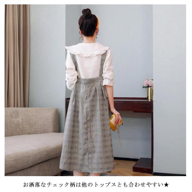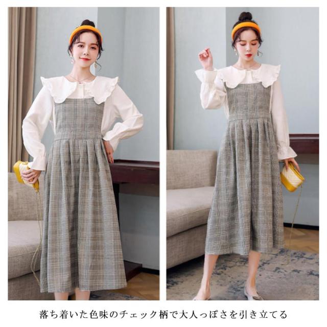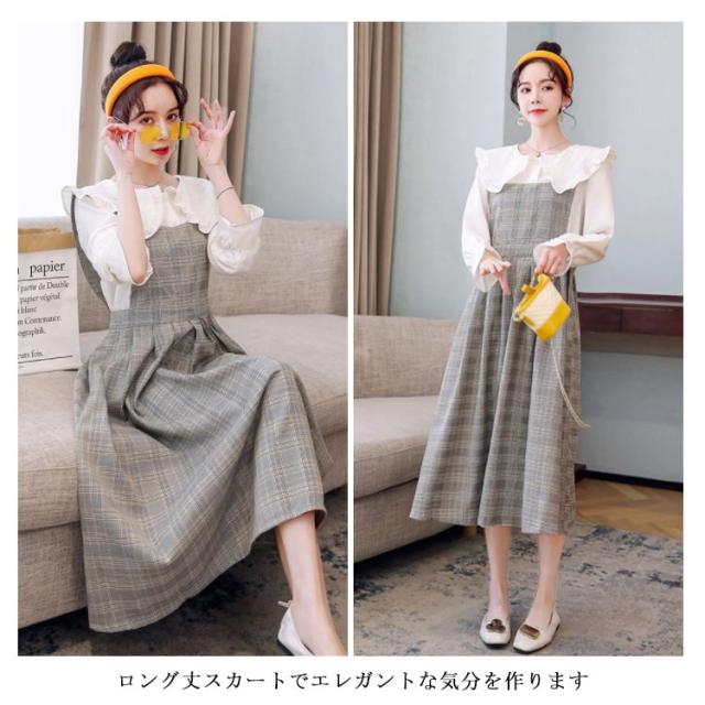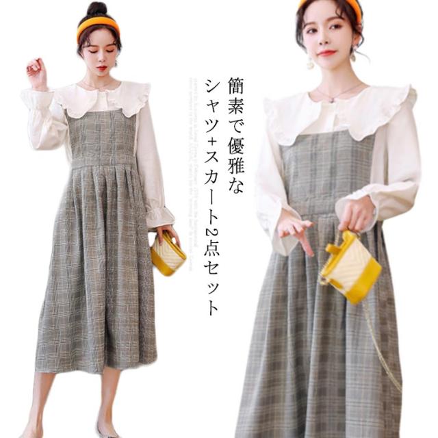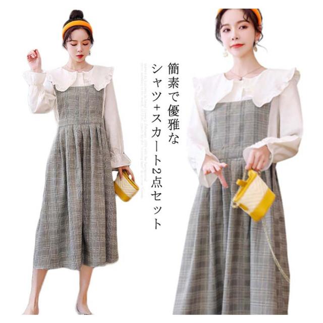 2点セット レディース 上下セット シャツ+スカート 長袖シャツ フレア袖 折襟 チェック柄 ミディアムワンピース 膝上丈ワンピース ロングスカート ジャンパースカート 優雅 大人 シンプル 普段着 お洒落 キレイめ セットアップ 春新作