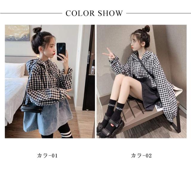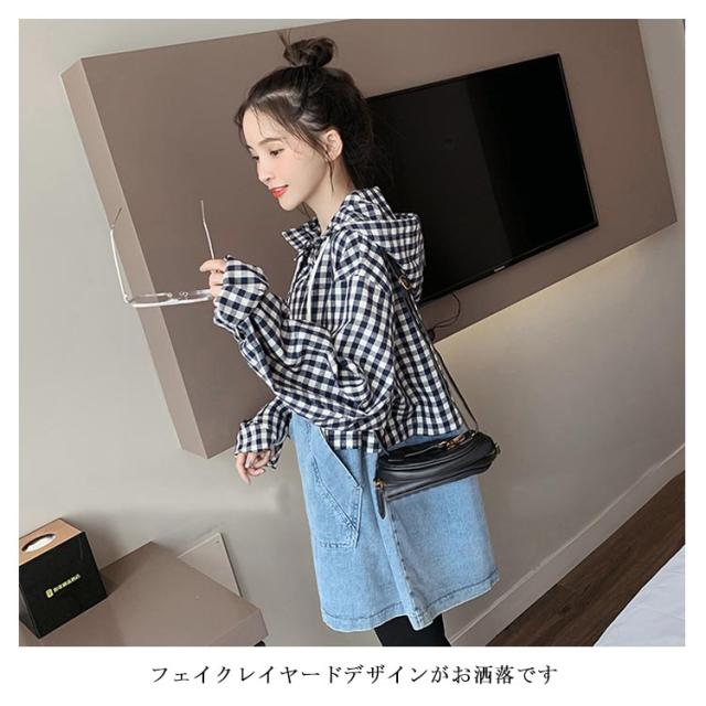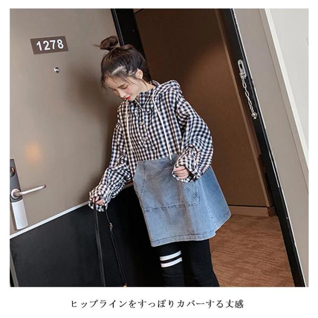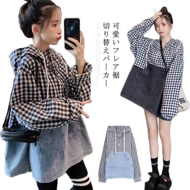 パーカー レディース チェック柄 プルパーカー デニム フード付き 切り替えパーカー フレア裾 ドロップショルダー ゆったり カジュアル ルーズ 体型カバー お洒落 キレイめ 普段着 トップス プルオーバー 春新作
