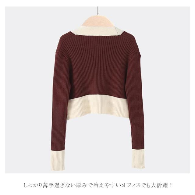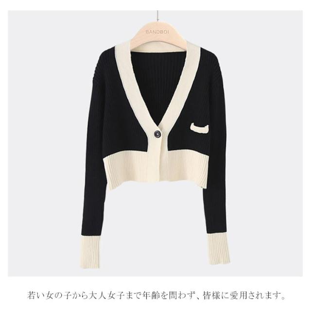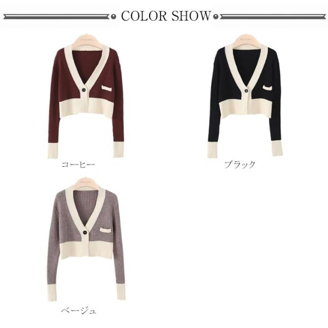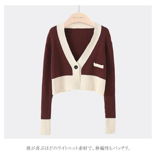 ニットカーディガン ショート丈 レディース カーディガン リブニット 春物 Vネック 羽織り アウター 配色 長袖 着痩せ ストレッチ お洒落