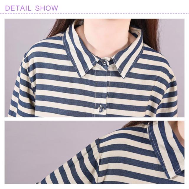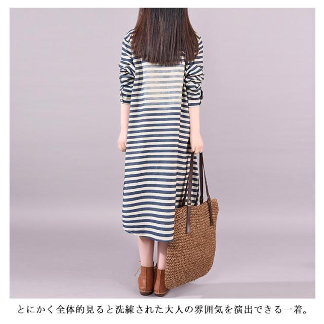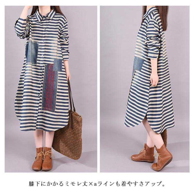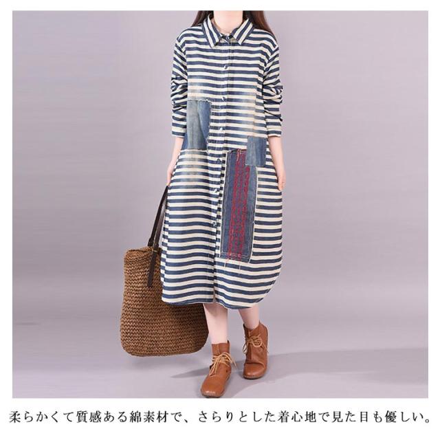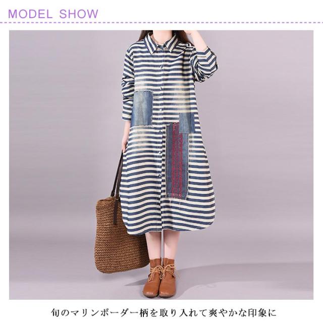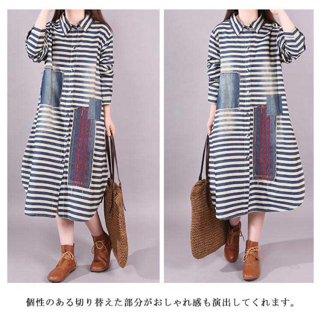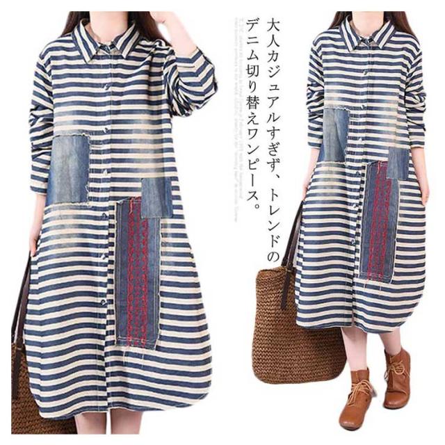 春服 シャツワンピース ワンピース ボーダー柄 カジュアルワンピース デニムワンピース 長袖ワンピース 前開き 襟付き 切り替え ゆったり 大きサイズ ミディアム ナチュラル 可愛い
