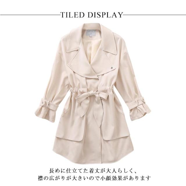 | どんなボトムスとでもスタイリングしやすいトレンドのスプリングコート(外套) ベルト付きで着痩せ効果もバッチリ(腰?) ゆったりとしたシルエットで体型カバーの役割も抜群(修身) ノッチラペル様式で大人らしい印象を与えます(?熟) 長めに仕立てた着丈が大人らしく、襟の広がりが大きいので小顔効果があります(?款,?? ??) | |