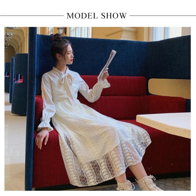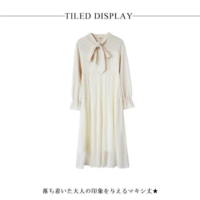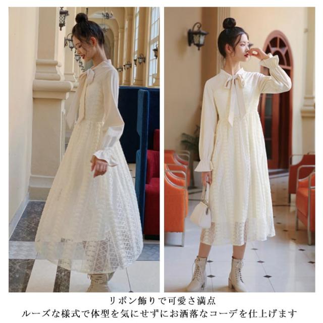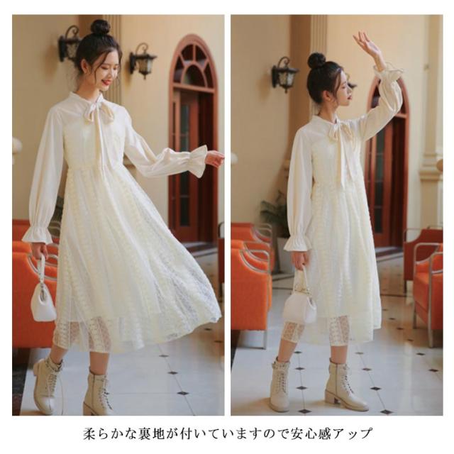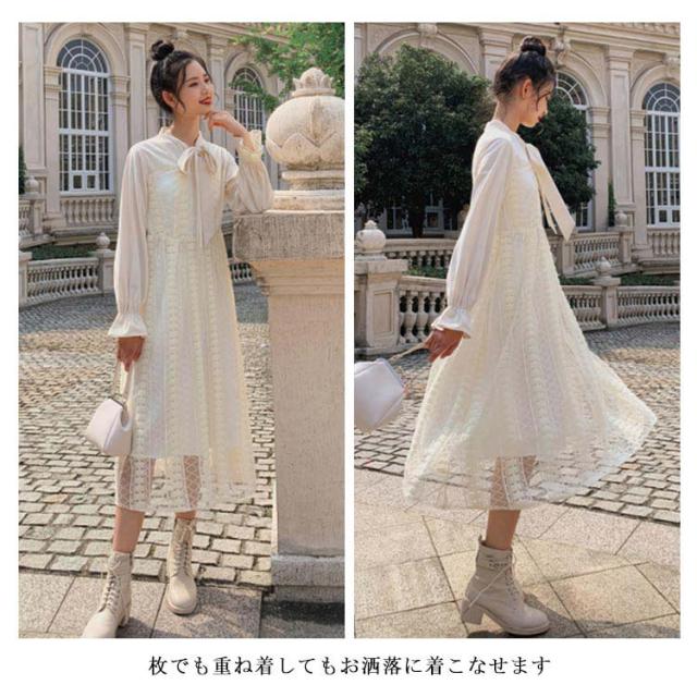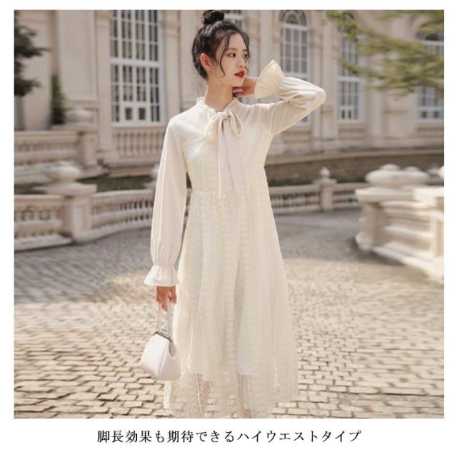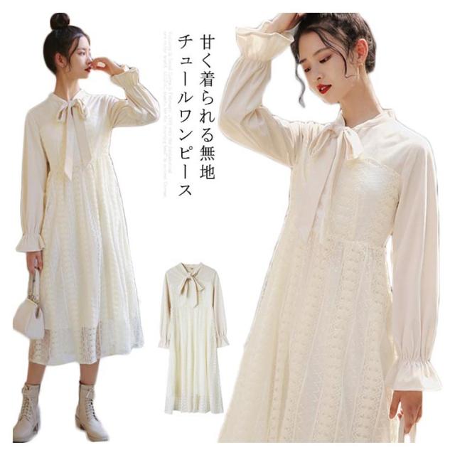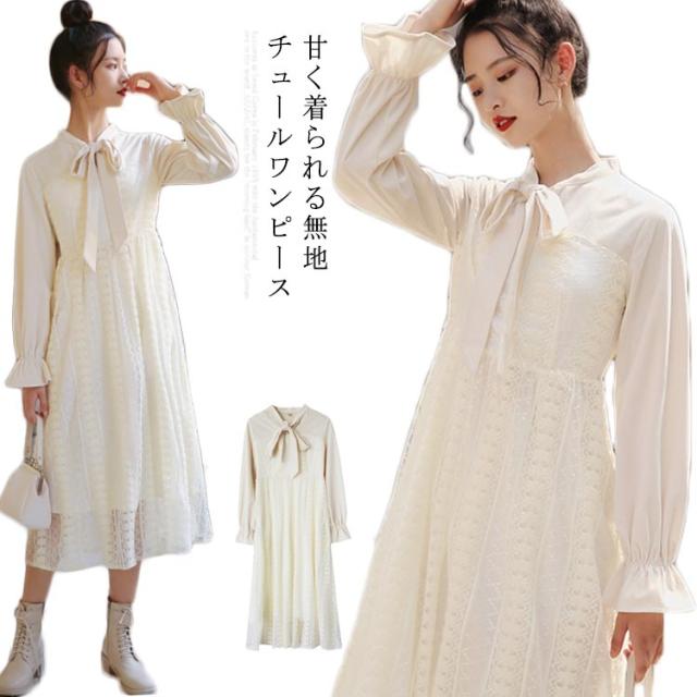 ワンピース レディース フレアワンピース 長袖 ロングワンピース マキシワンピース レースワンピース チュール ロング丈 裏地付き フリル ハイウエスト フレア Aライン 軽やか 大人可愛い お洒落 こなれ感 春新作