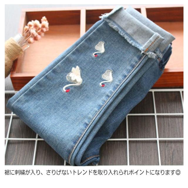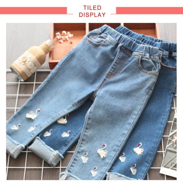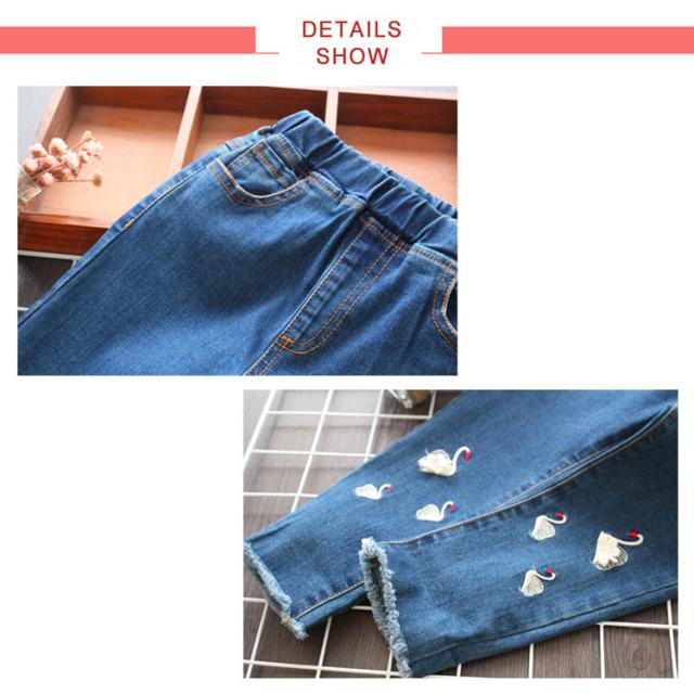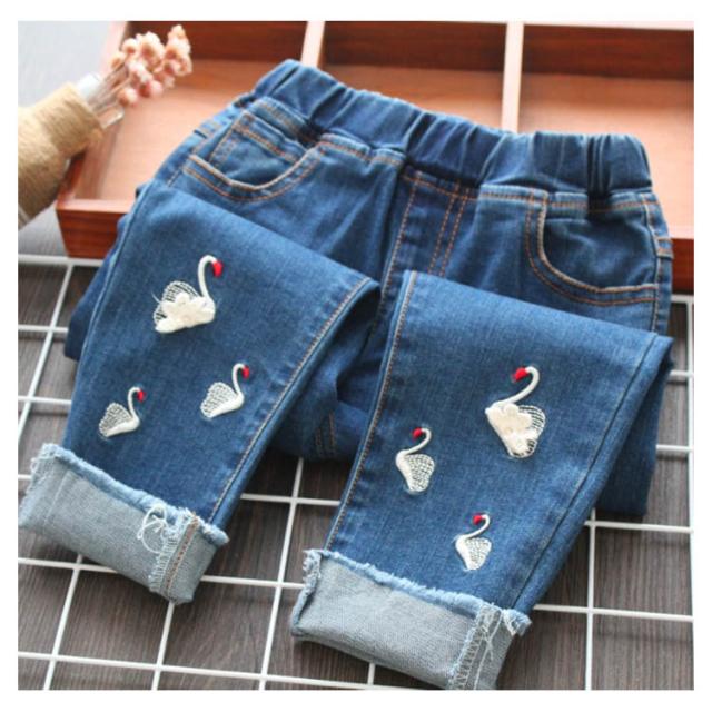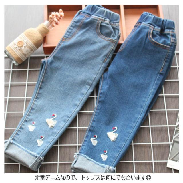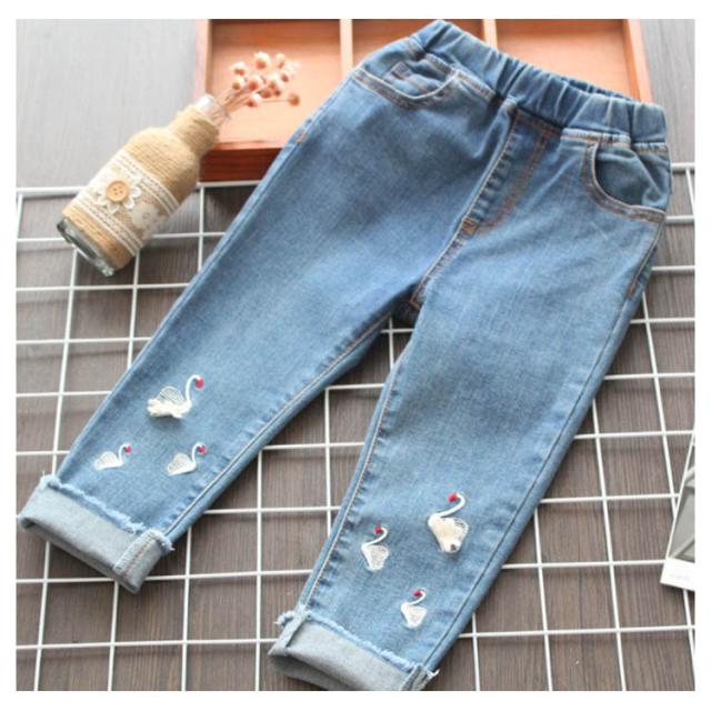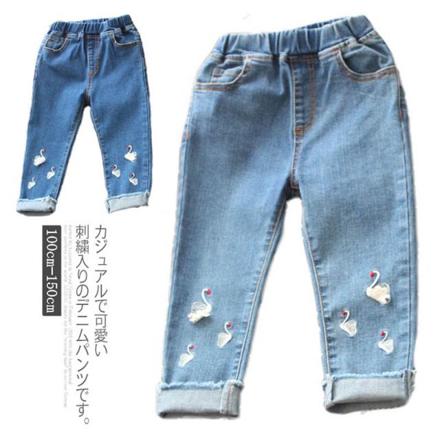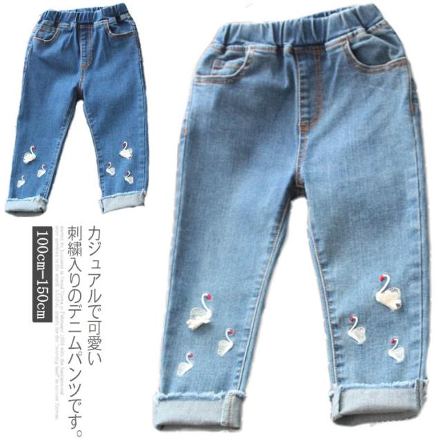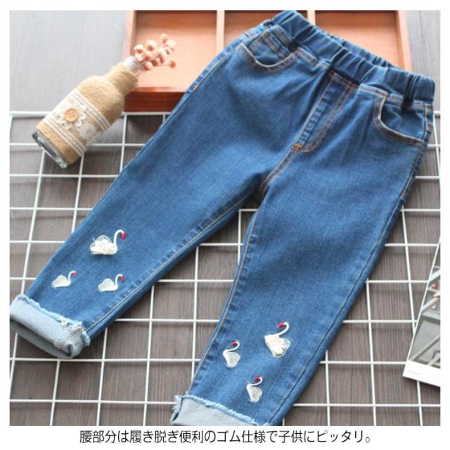 送料無料 デニムパンツ 女の子 パンツ ロング丈 長ズボン 子供服 キッズ服 ウエストゴム 刺繍 白鳥 可愛い 秋物 新作 ボトムス ロングパンツ ジーンズ 100 110 120 130 140 150