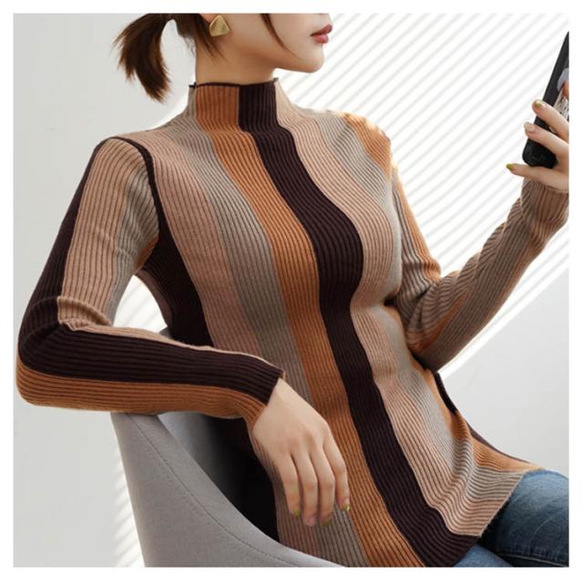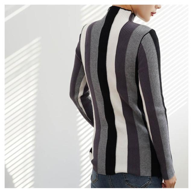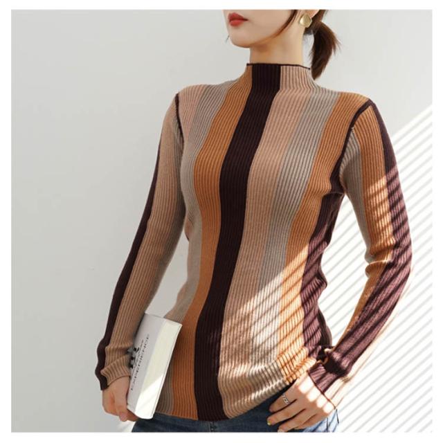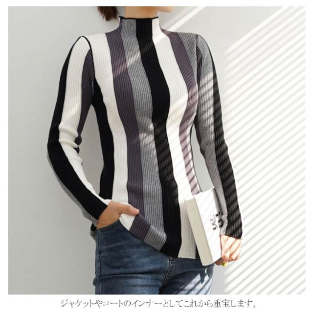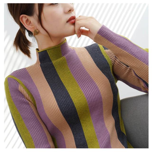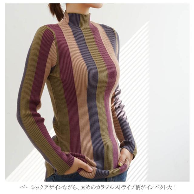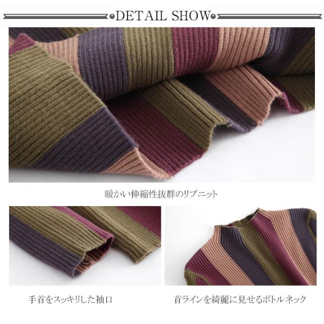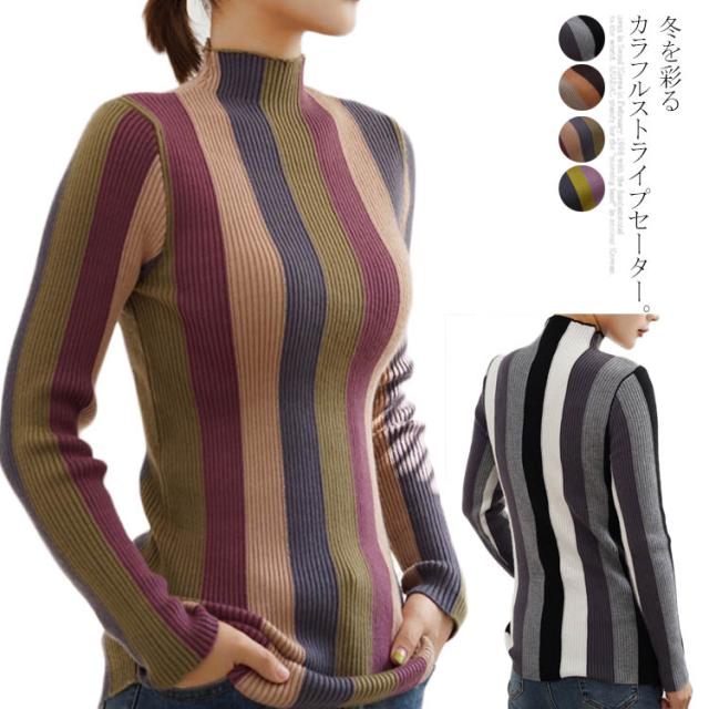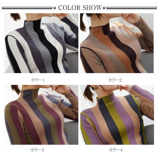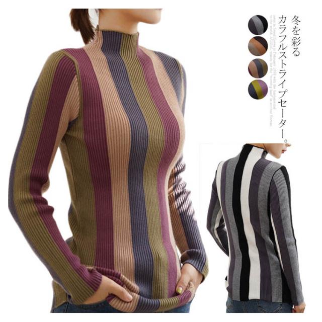 カラフル セーター ハイネック ニットトップス レディース ストライプ ボーダー ニットセーター インナー ニットトップス ハイネック ボルトネック 長袖 リブ編み スリム タイト 通勤 おしゃれ