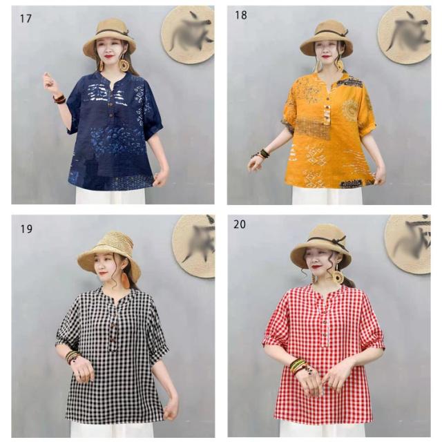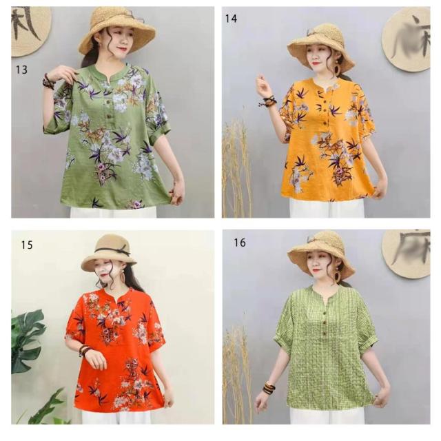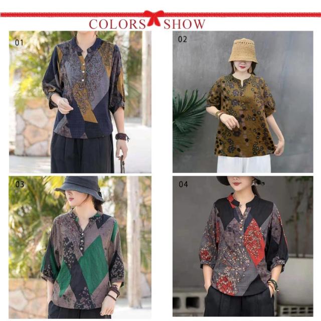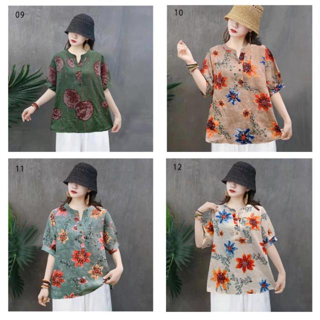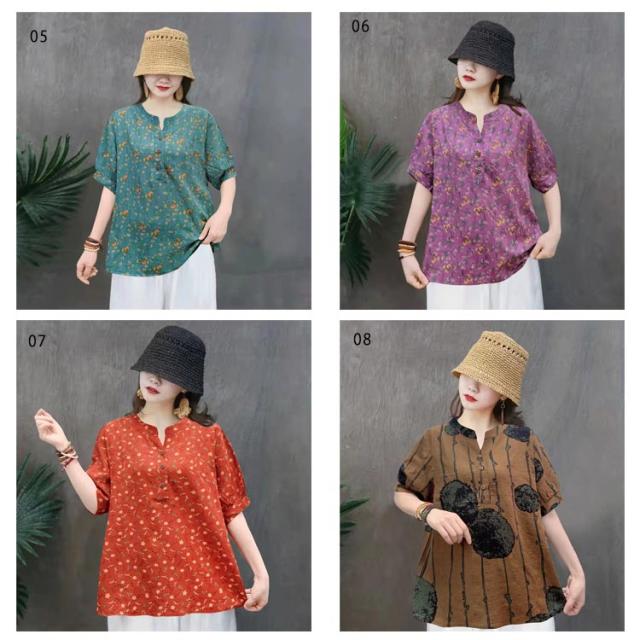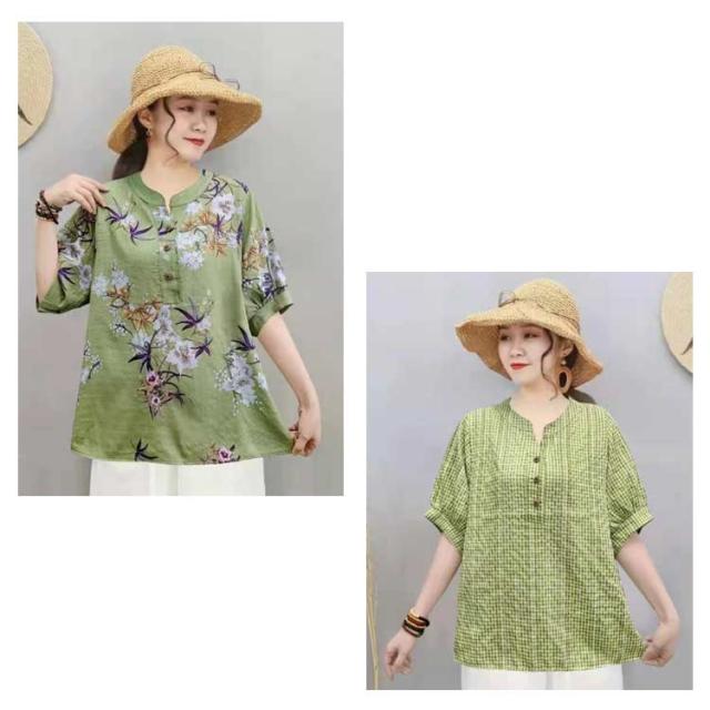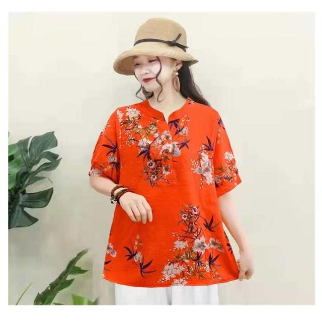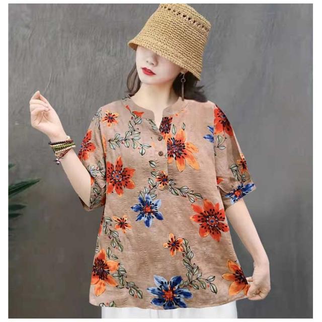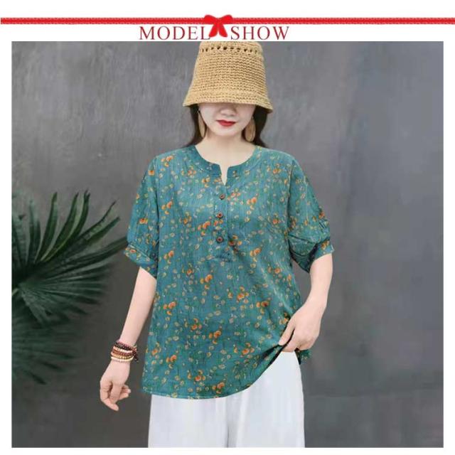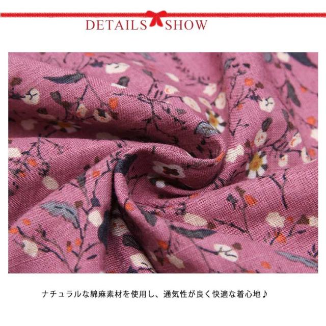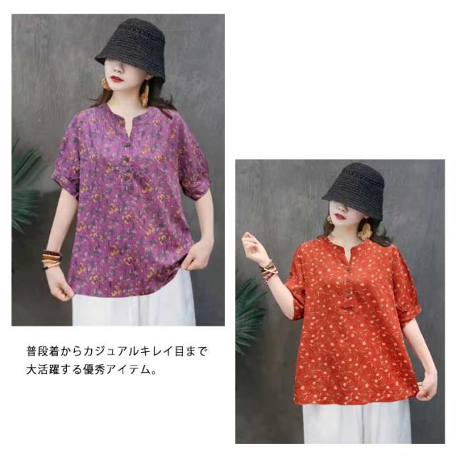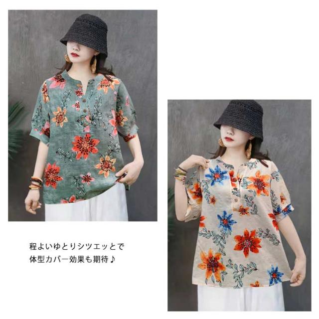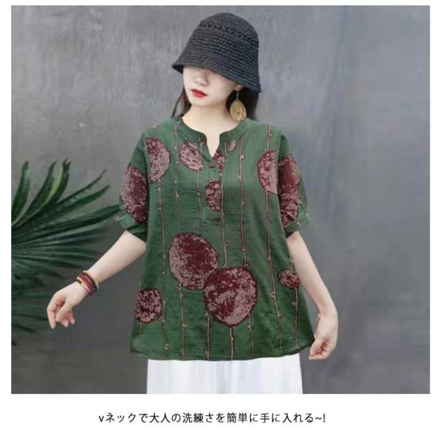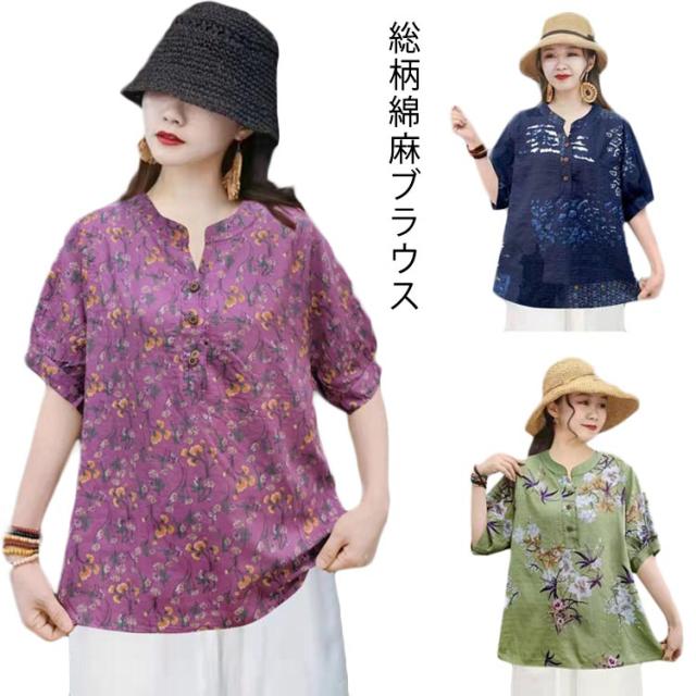 レディース シャツ 吸湿 柄 花柄 シャツブラウス vネック リネン ブラウス 半袖 トップス 綿麻 プルオーバー ゆったり 体型カバー 綿 柄 麻 薄手 夏 春 涼しい コットン