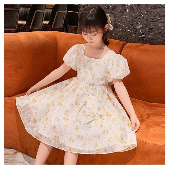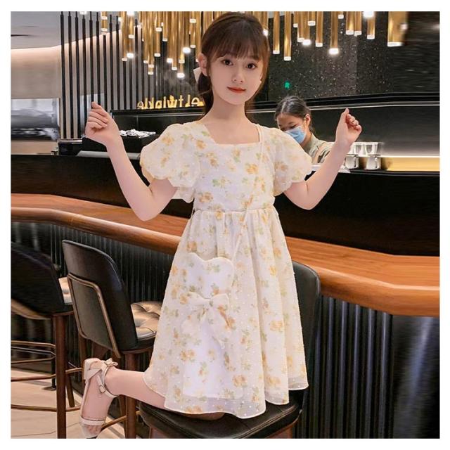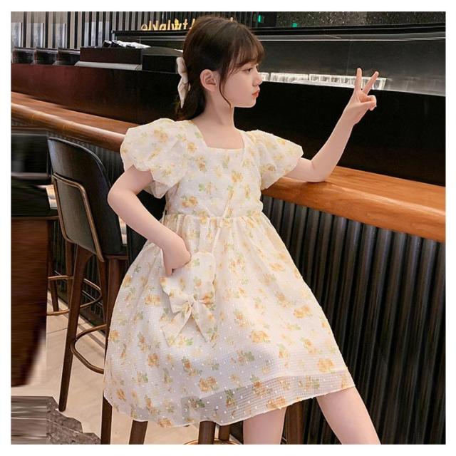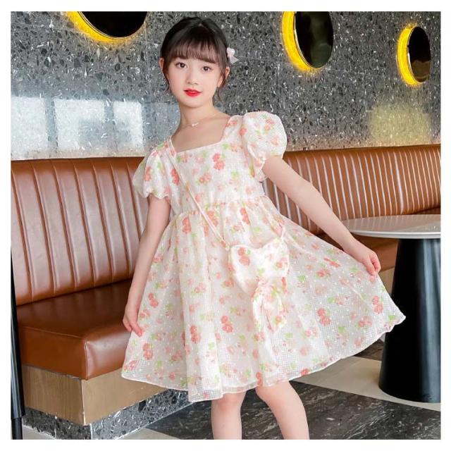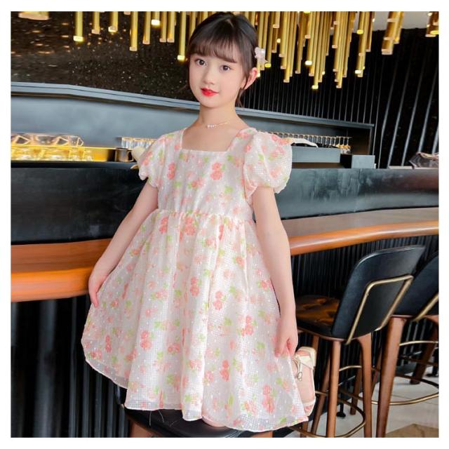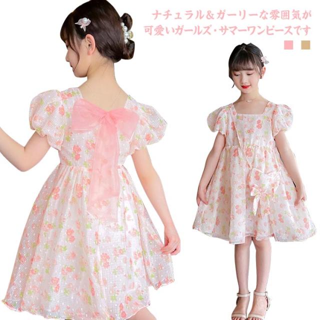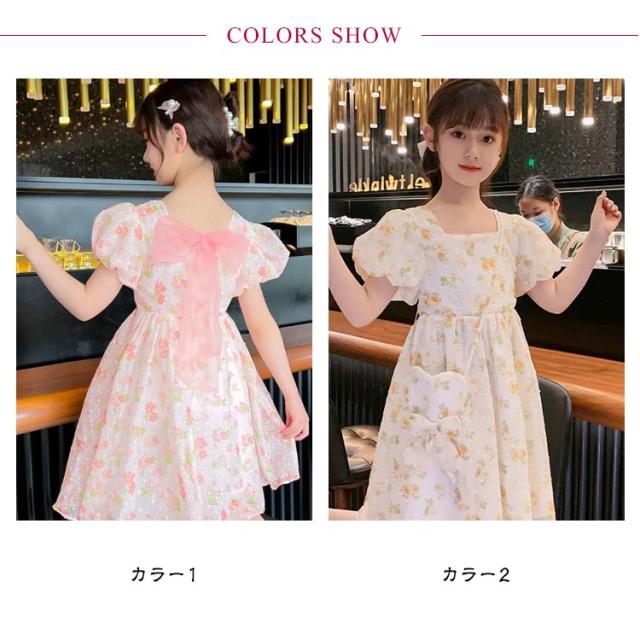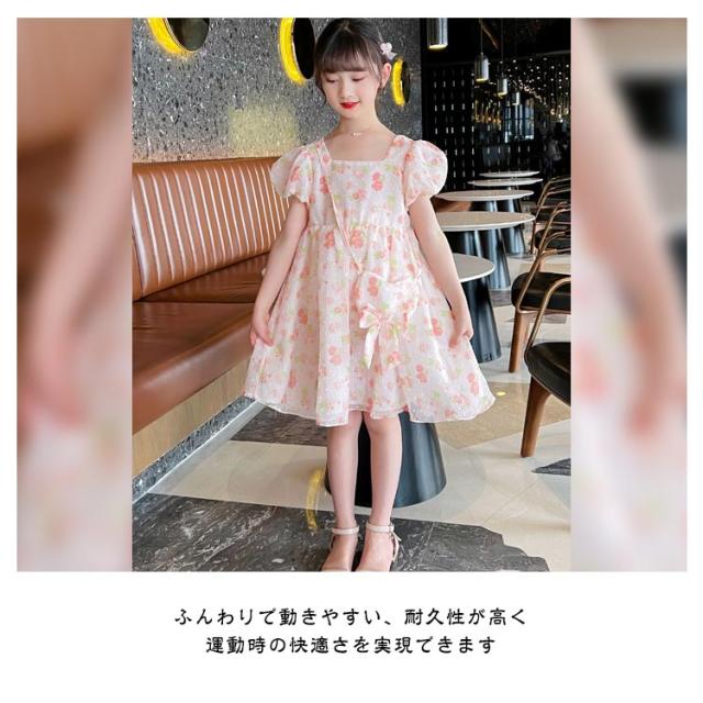 キッズ 半袖 ワンピース フレアワンピース ワンピ ロング丈ワンピ スクエアネック 子供服 こども服 夏服 体型カバー 学生 女の子 お出掛け 海辺 かわいい ゆったり 110 120 130 140 150 160 170