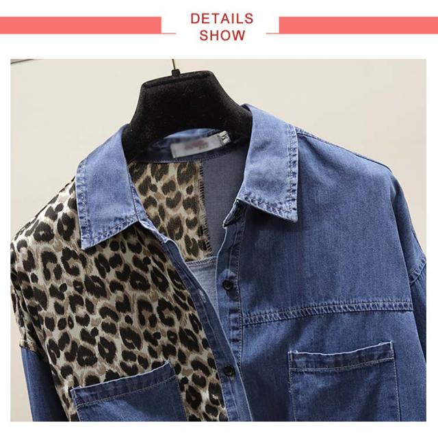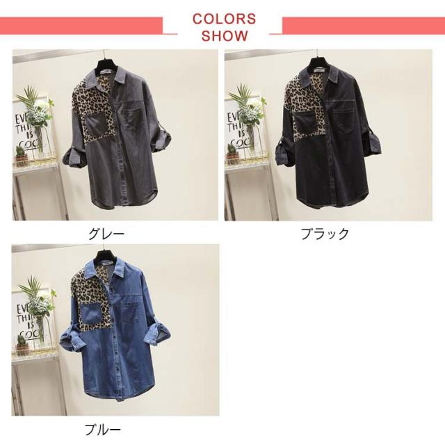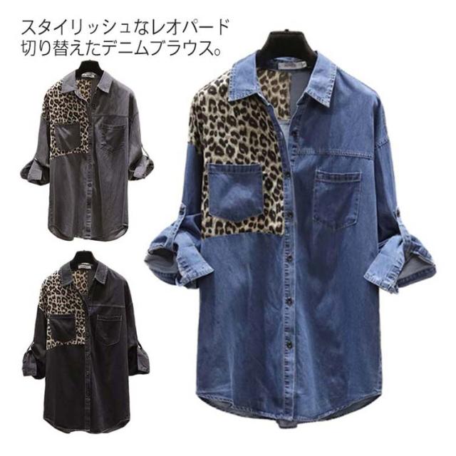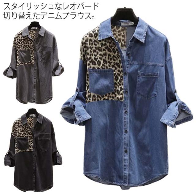 《送料無料》スタイリッシュなレオパード切り替えが旬!春新作 ヒョウ柄切り替えトップス レディース デニムブラウス デニムシャツ デニム トップス 長袖 シャツ ブラウス ウエスタン レオパード ポケット