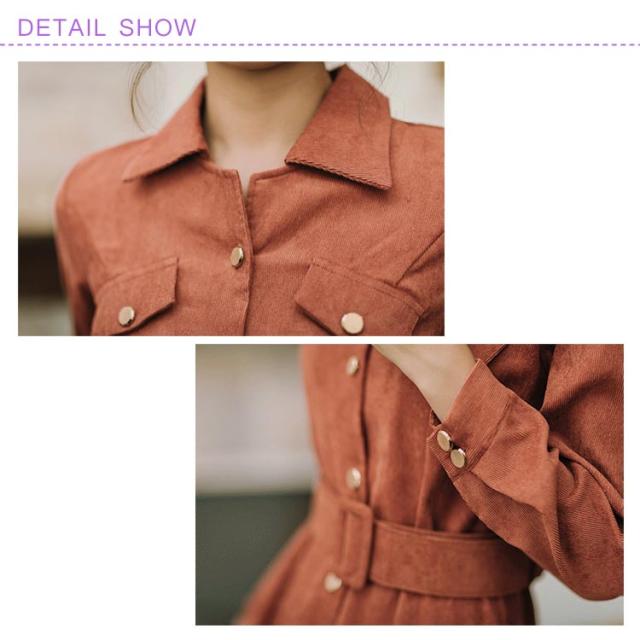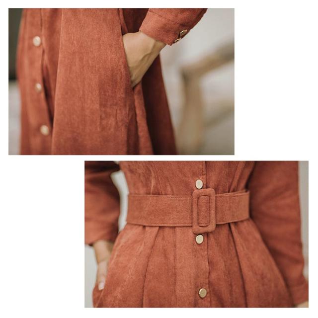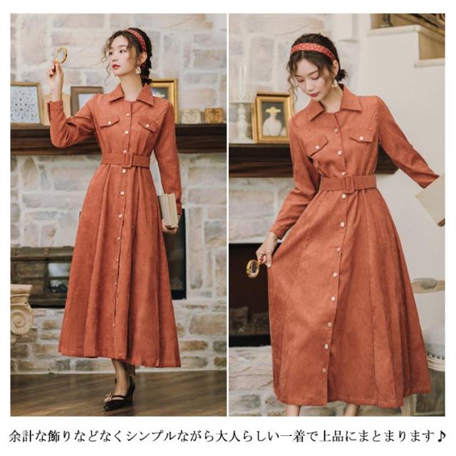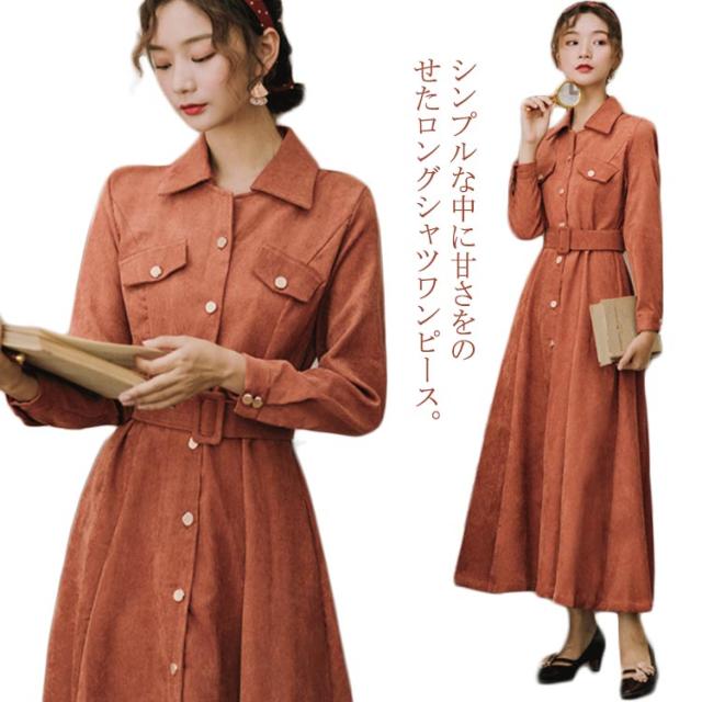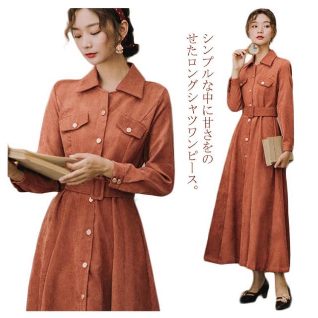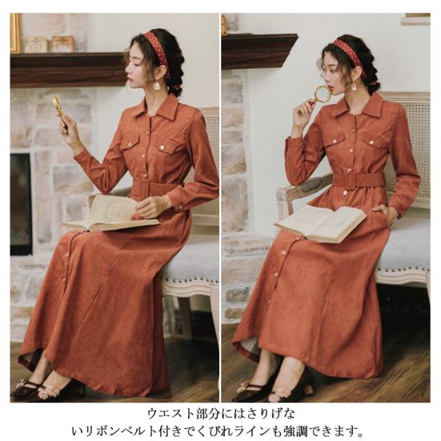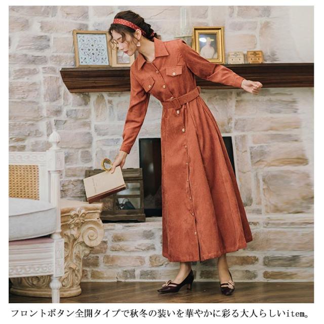 前開きロングワンピース コーデュロイシャツワンピース ワンピース シャツワンピース ロング 長袖 ウエストベルト付き 膝下丈 コーデュロイ素材 秋 冬