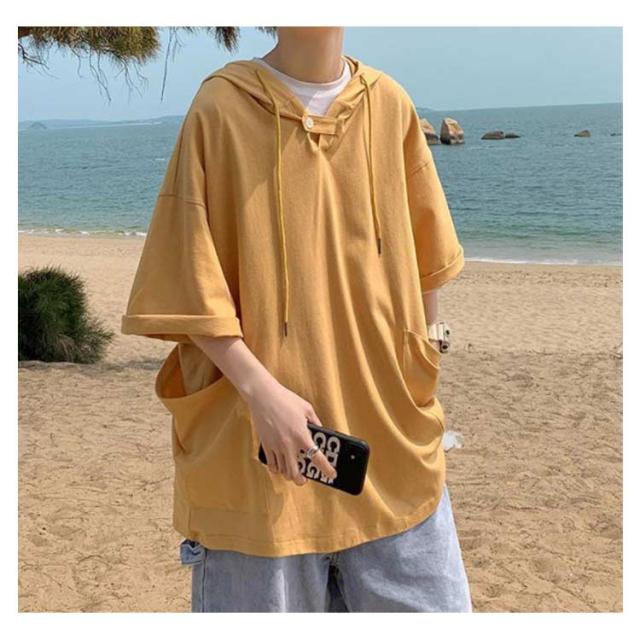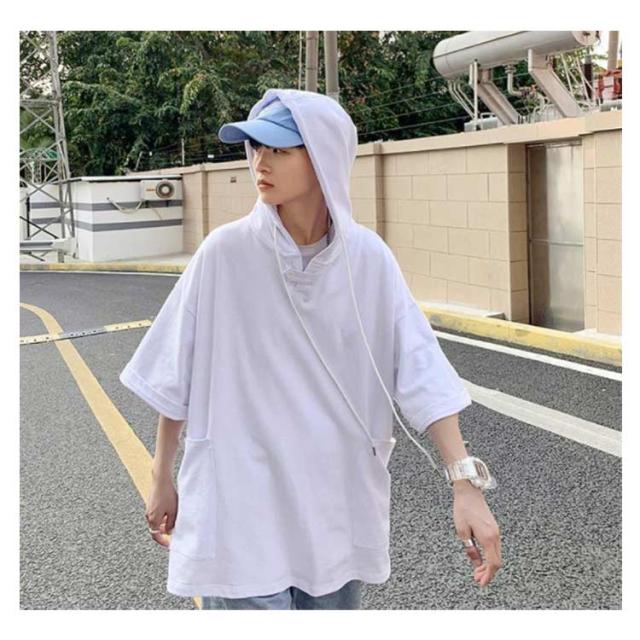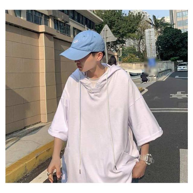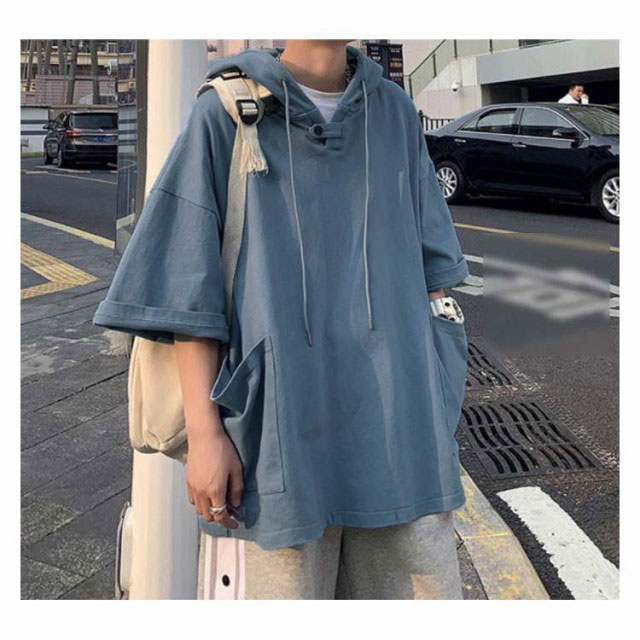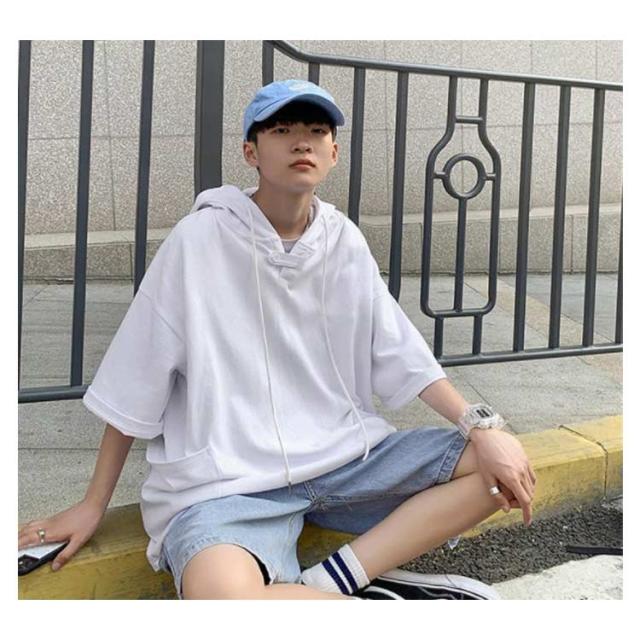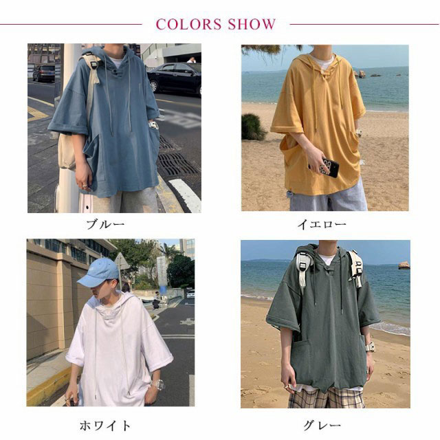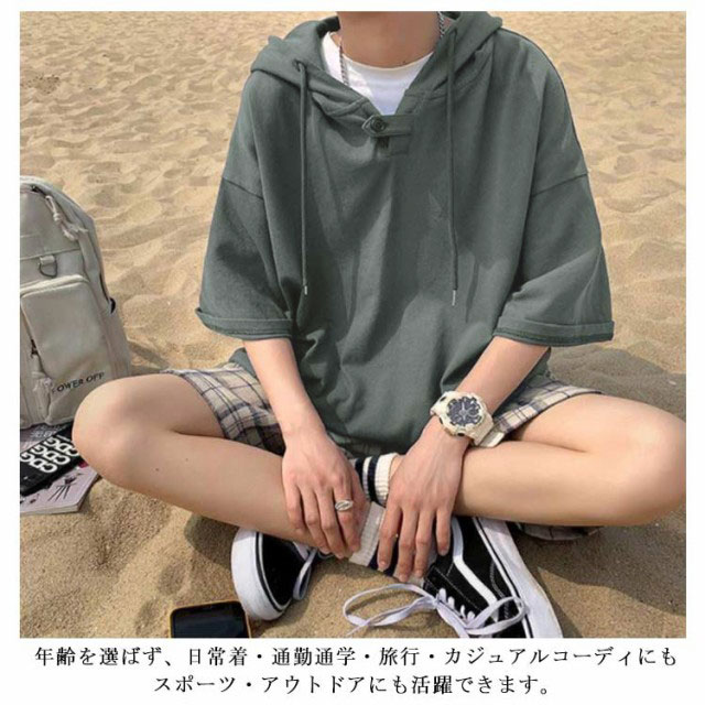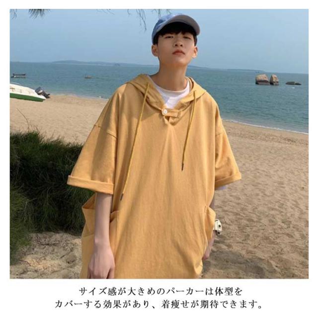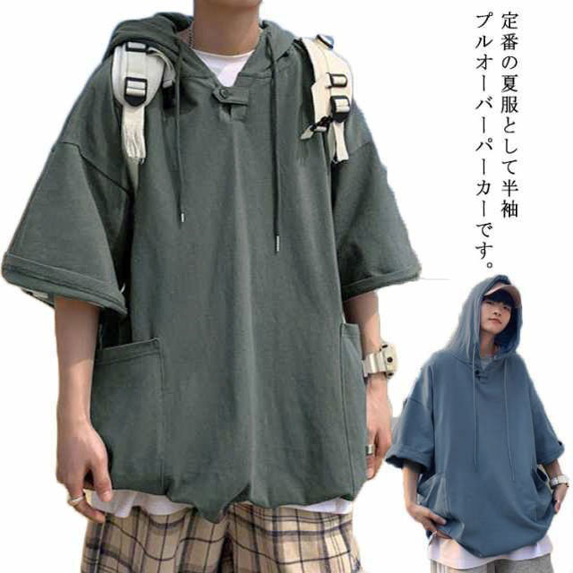 パーカー 夏服 大きいサイズ メンズ プルオーバーパーカー トレーナー トップス パーカ フード付き 夏 tシャツ ドロップショルダー ビックシルエット ゆったり 無地 薄手 半袖