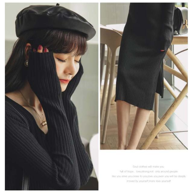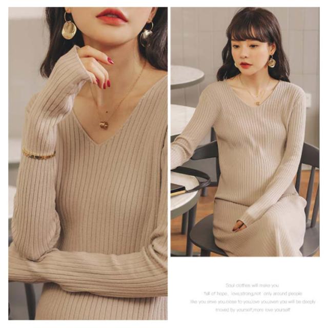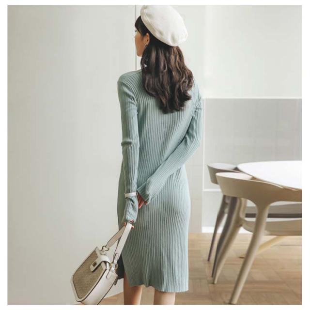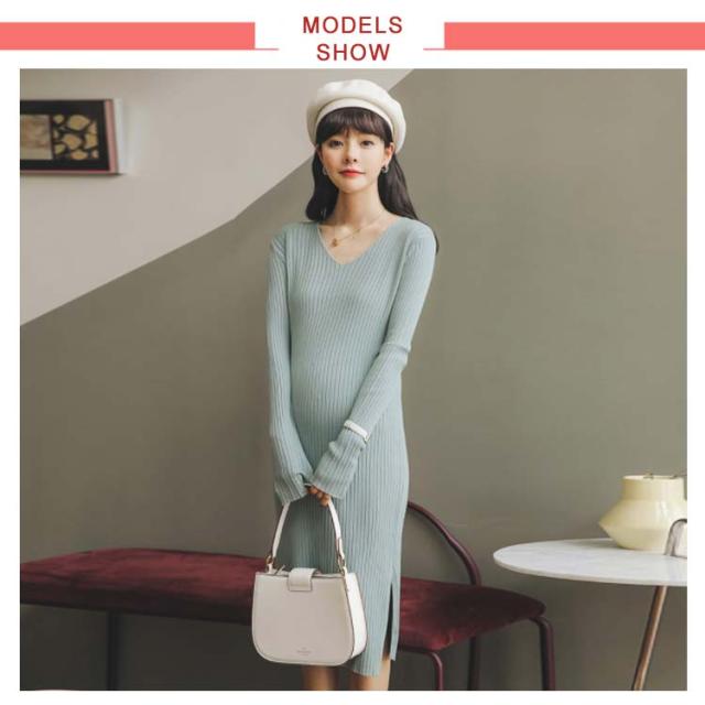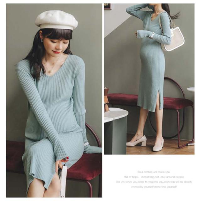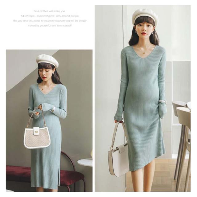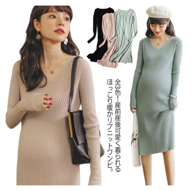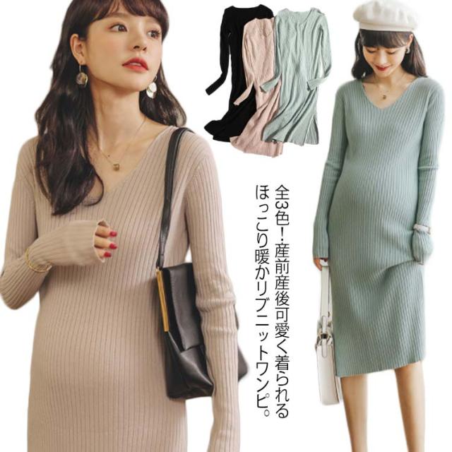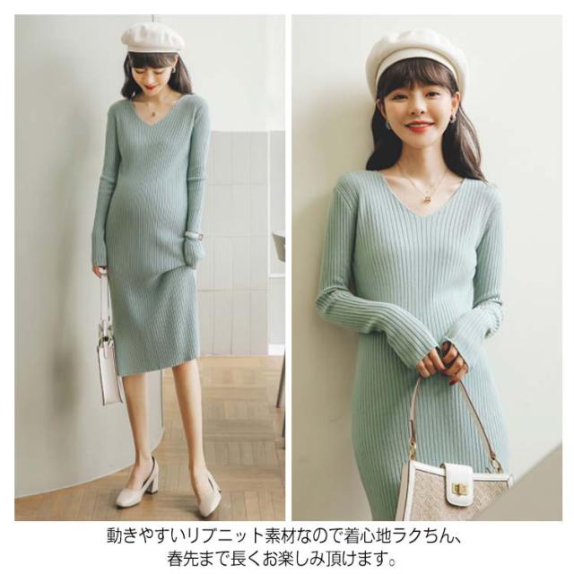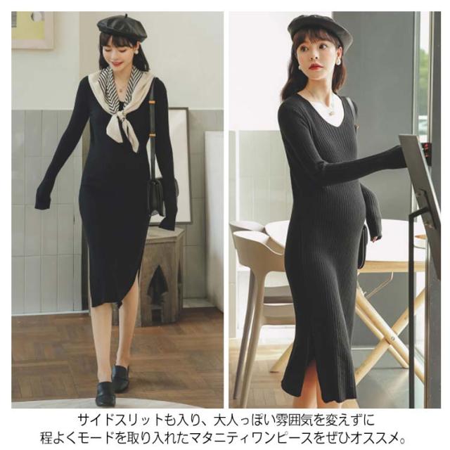 《送料無料》全3色!マタニティワンピース ニットワンピース マタニティウェア マタニティ服 リブニット 長袖ワンピース Vネック スリット 冬 秋冬 秋 長袖 マタニティワンピ ニットワンピ あったか シンプル 無地
