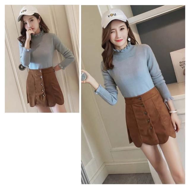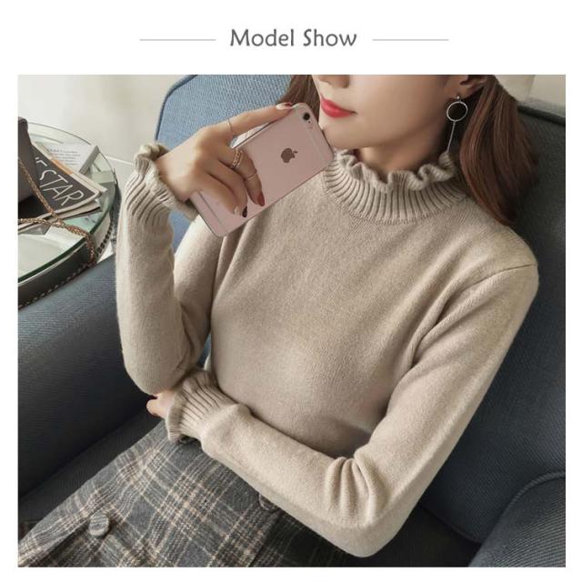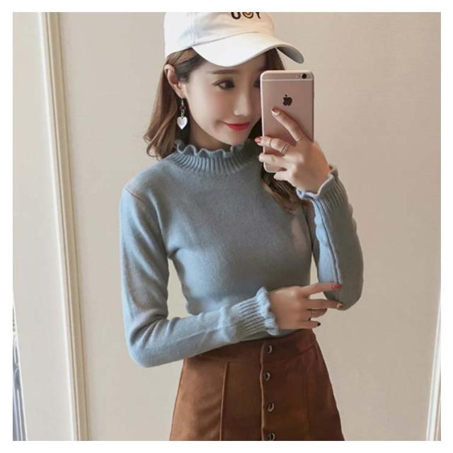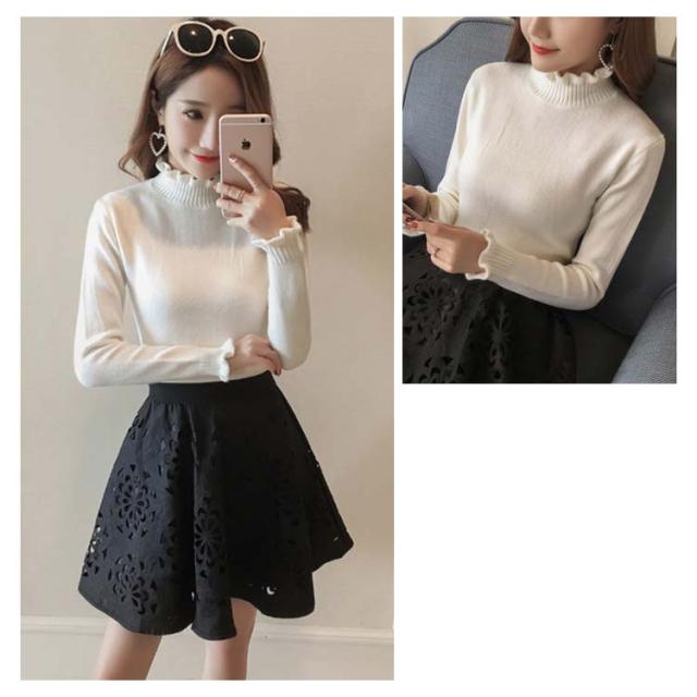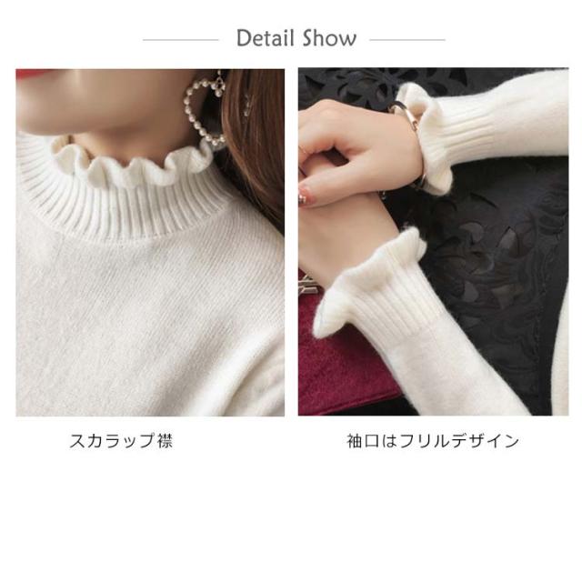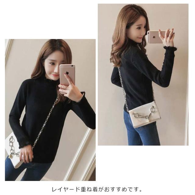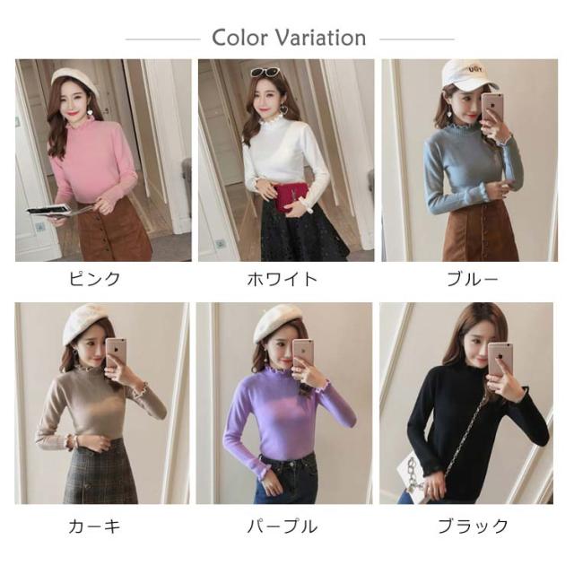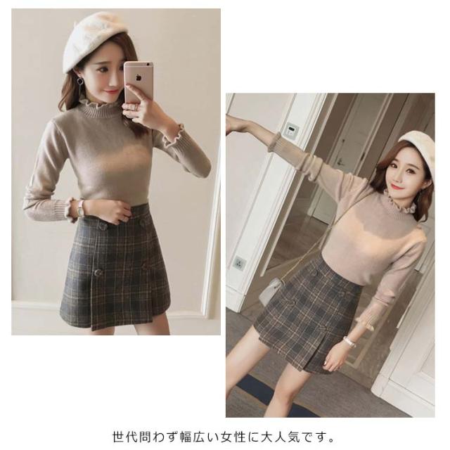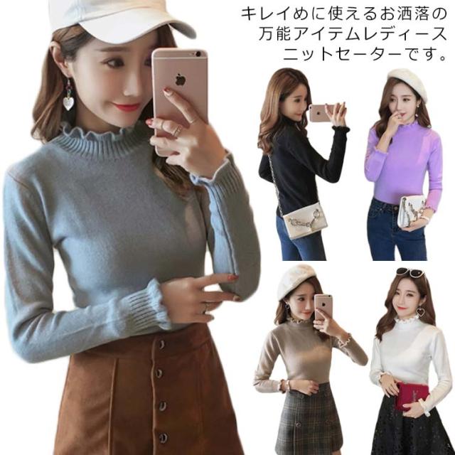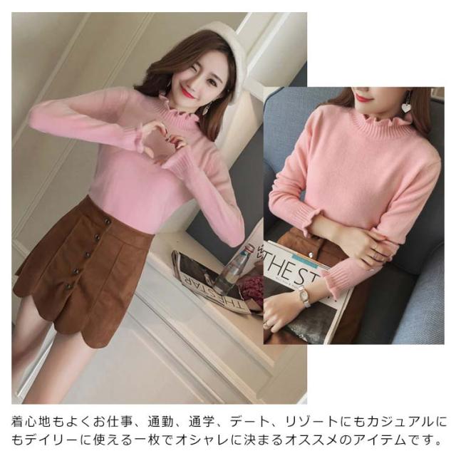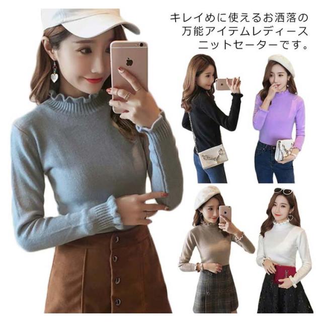 《送料無料》ニットトップス ハイネック スカラップ襟 タイト ニットセーター タートルネック レディース 無地 長袖 チュニック カジュアル 春秋冬 通勤 通学 可愛い 新作