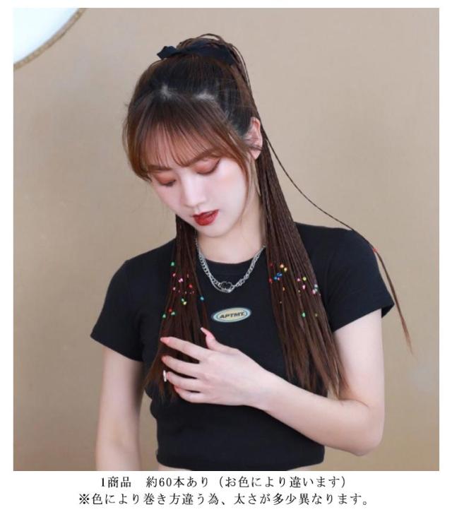 | 自分の髪は簡単にキレイに隠れてので、お洒落の皆さん是非試して頂きたいのです。 ファッションアイテムとしてはもちろん、コスプレアクセサリー、クリスマス、舞踏会などのプレゼントとして最適です簡単に装着出来るので短時間でイメチェン可能、 簡単に地毛を生かし変身出来ます。 1商品 約60本あり(お色により違います) ※色により巻き方違う為、太さが多少異なります。 | |
