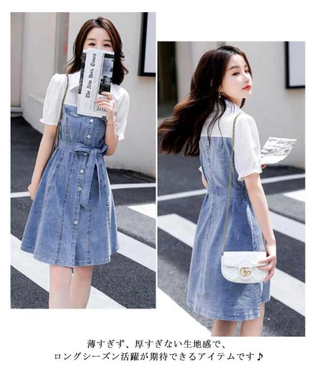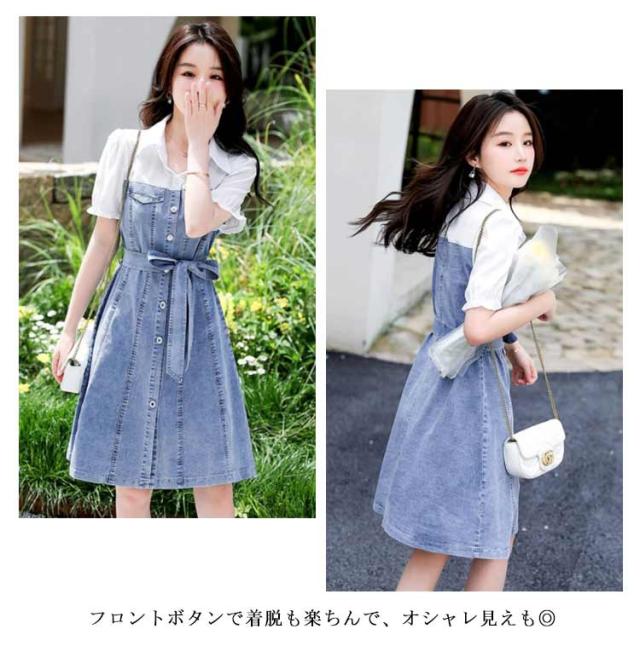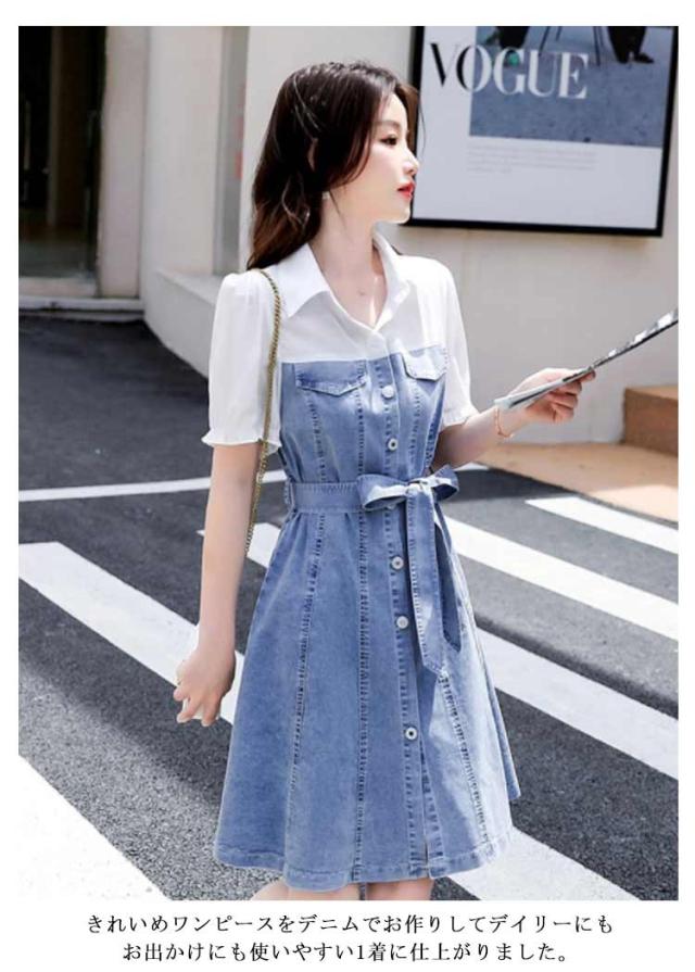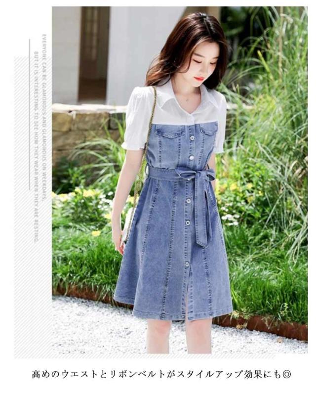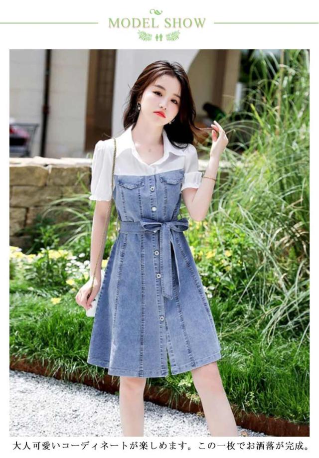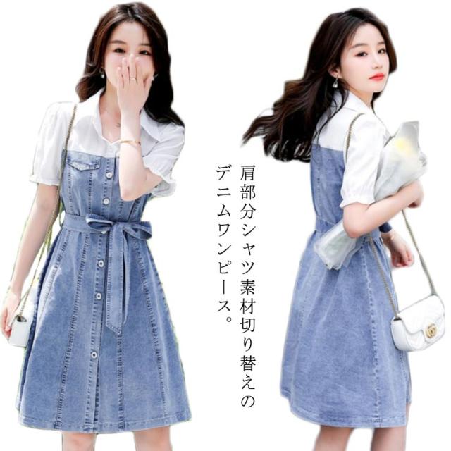 フロントボタン 切り替え レイヤード風 ミディ丈 シャツワンピース 通勤 膝丈 【送料無料】デニムワンサイズ リボン Aライン シンプル 通学 重ね着風 お呼ばれ 【送料無料】デニムワンサイズ 女子会 カジュアル 二次会 20代 半袖