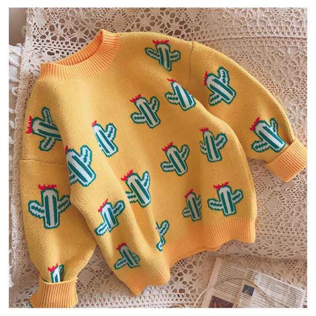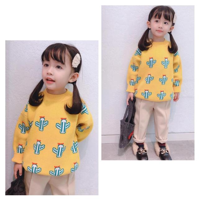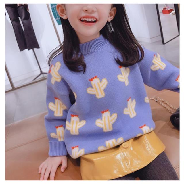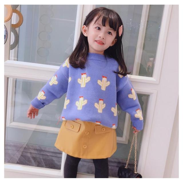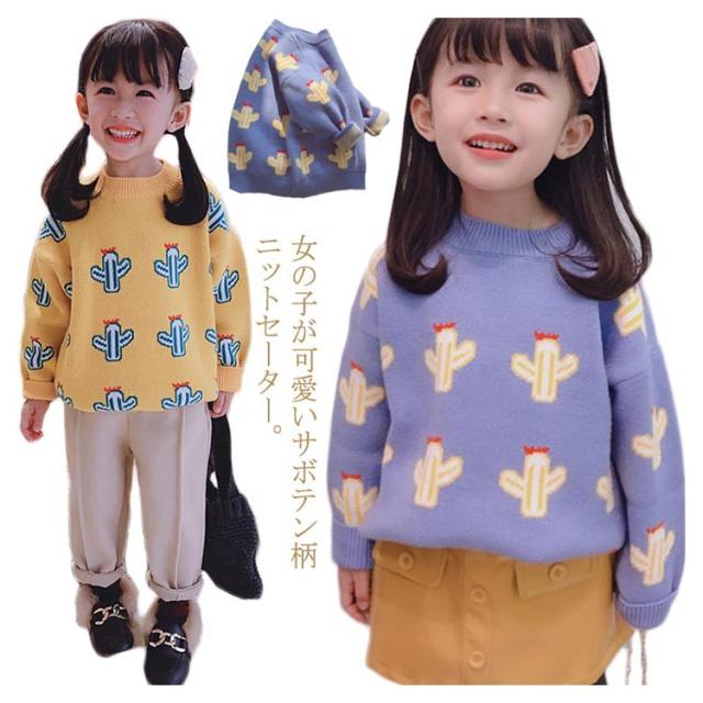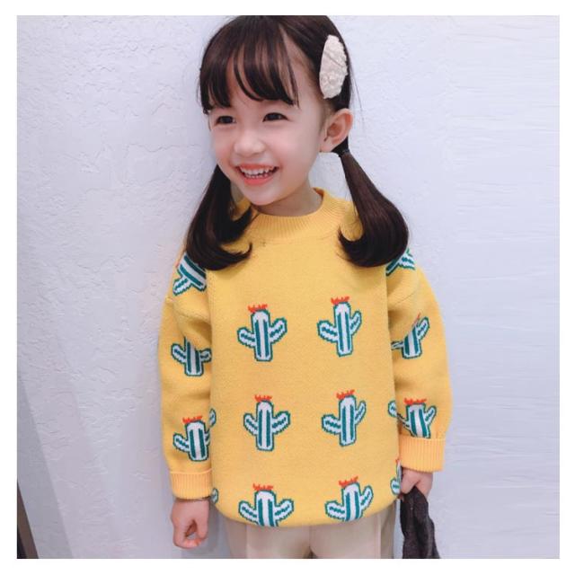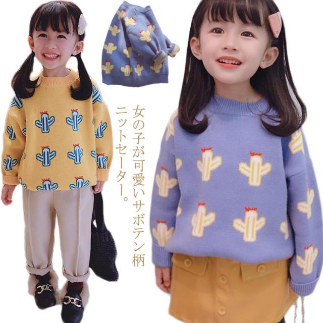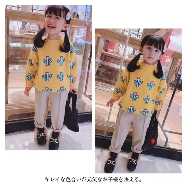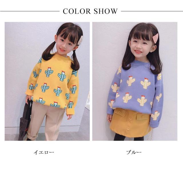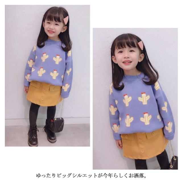 | 女の子が可愛いサボテン柄ニットセーター。 キレイな色合いが元気なお子様を映える。 ゆったりビッグシルエットが今年らしくお洒落。 パンツスタイルにもスカートスタイルにもボトムスを選ばない秋冬コーデの主役級アイテム。 | |