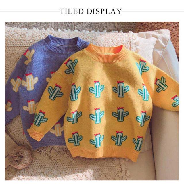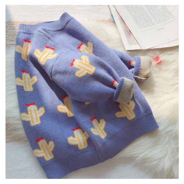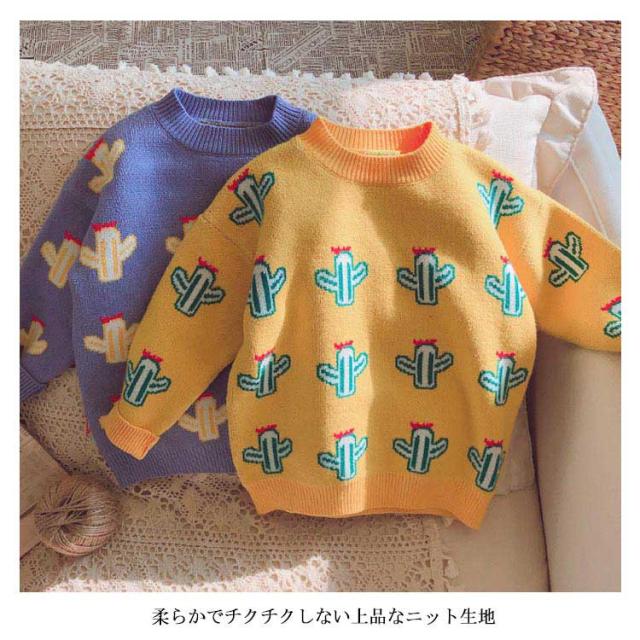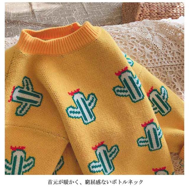 ニットセーター 子供服 女の子 男の子 セーター ニットトップス 長袖 秋服 冬服 ボトルネック ドロップスリーブ ゆったり 可愛い サボテン 子ども ファッション キッズ プチプラ 保育園 幼稚園 通園