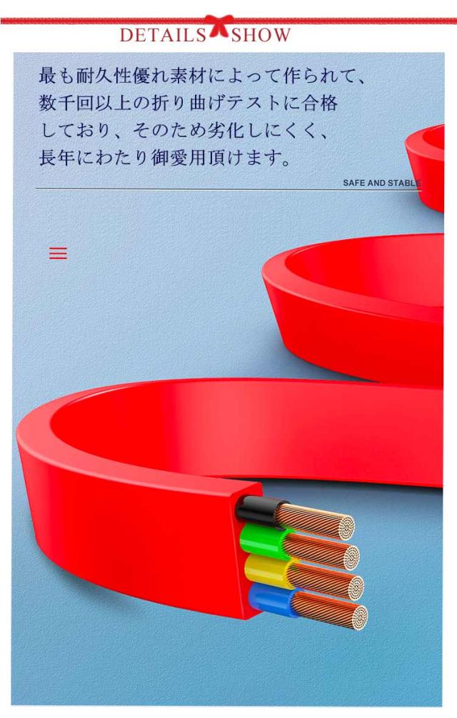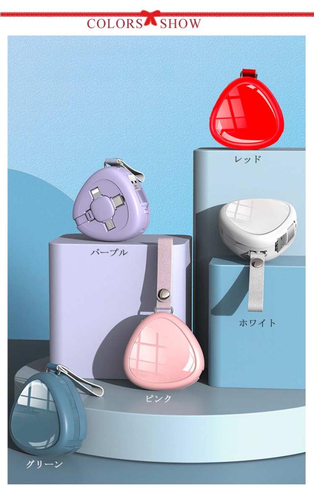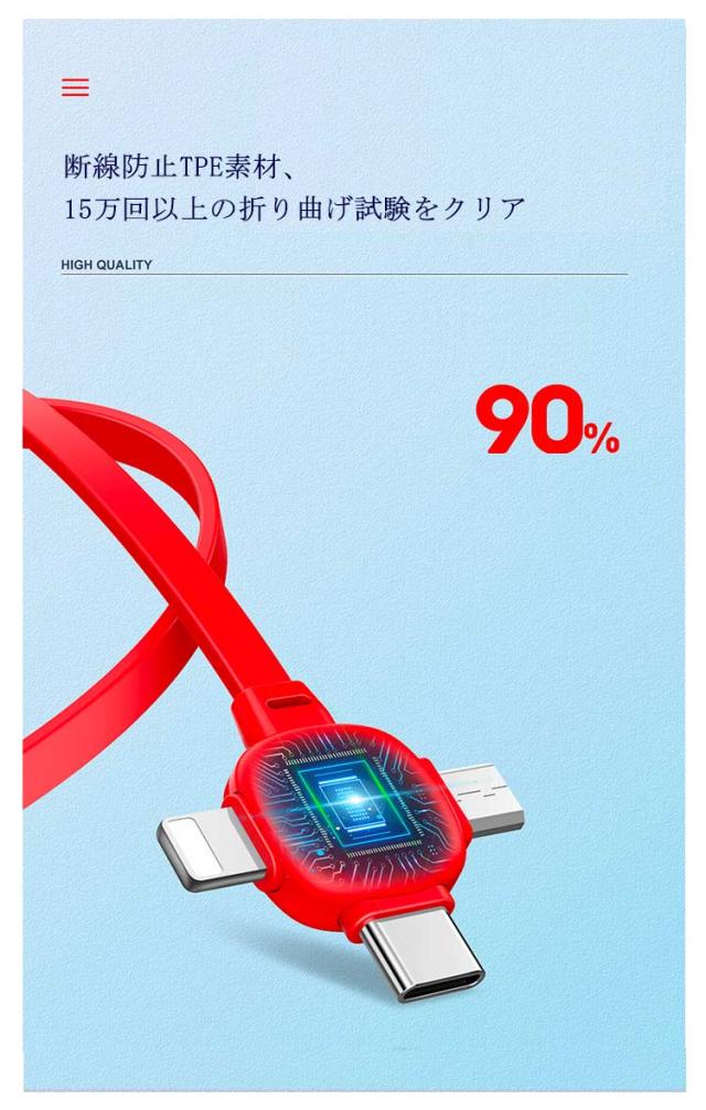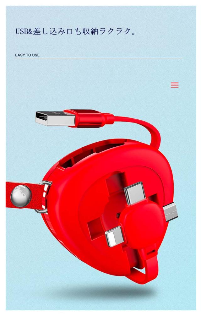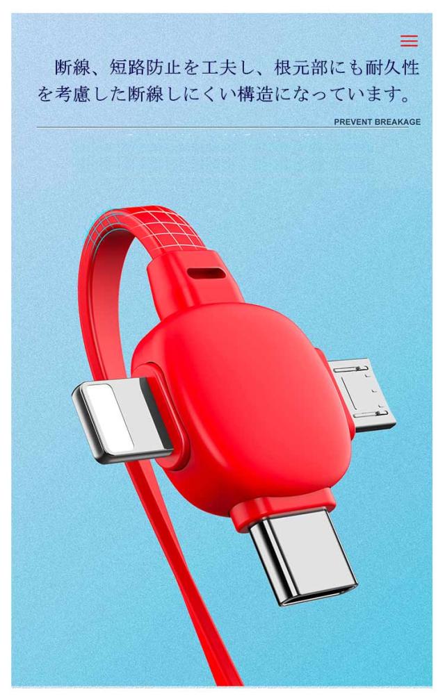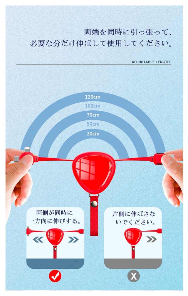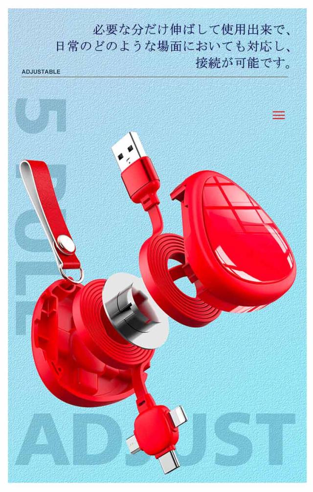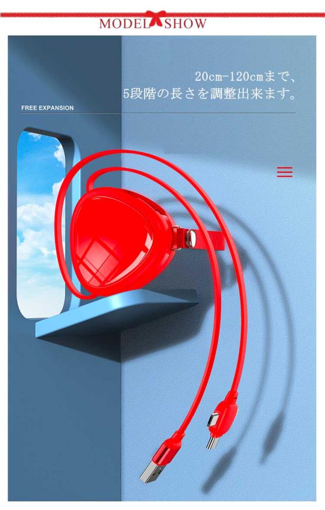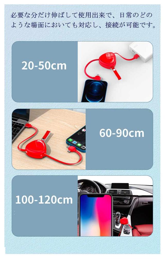 | 3in1 充電ケーブル iphone/android/type-c 3A 20cm-120cmまで、5段階の長さを調整出来ます。 必要な分だけ伸ばして使用出来で、日常のどのような場面においても対応し、接続が可能です。 断線、短路防止を工夫し、根元部にも耐久性を考慮した断線しにくい構造になっています。 最も耐久性優れ素材によって作られて、数千回以上の折り曲げテストに合格しており、そのため劣化しにくく、長年にわたり御愛用頂けます。 両端を同時に引っ張って、必要な分だけ伸ばして使用してください。 使用したら、両端を同時に引っ張って、手を緩めて、巻き取りケーブルは自動的に収縮します。 | |