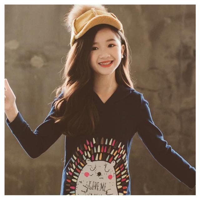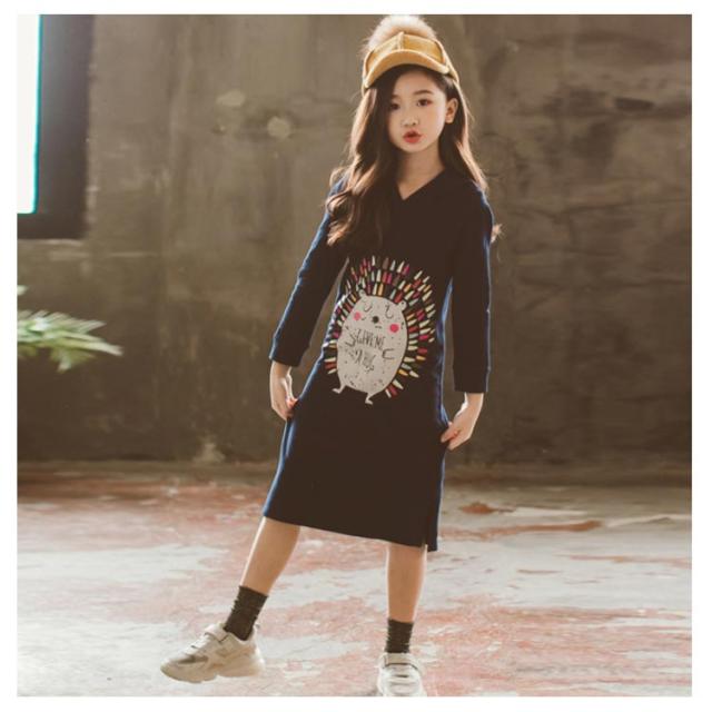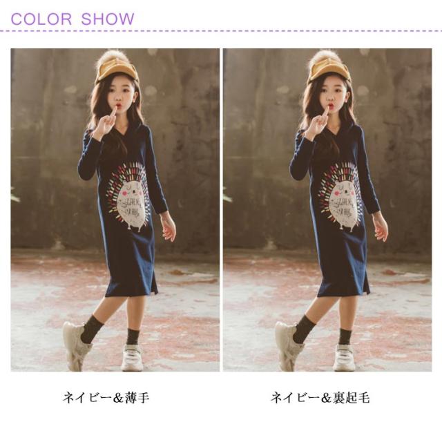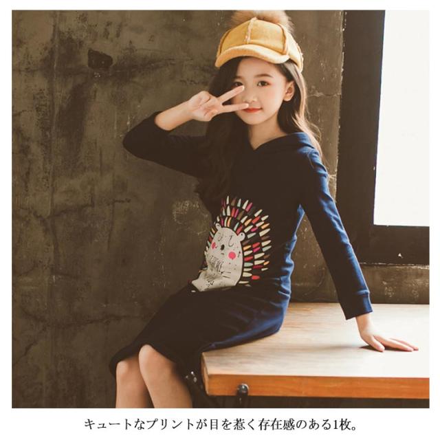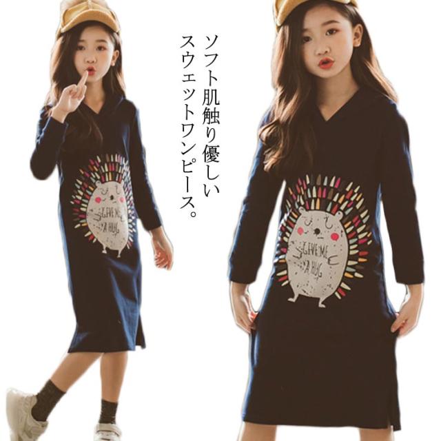 パーカーワンピース 女の子 ジュニア キッズ ワンピース 長袖 薄手 スウェットワンピース スウェット ロング パーカー 親子ペア 裏起毛 暖かい 春秋 冬 フード付き ビンテージプリント 膝下シンプル 通園 通学 お洒落 ファッション