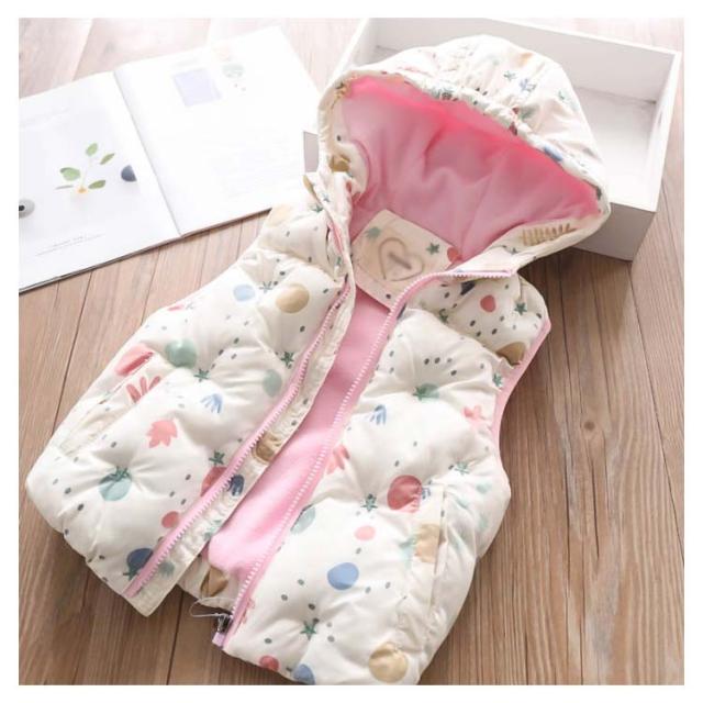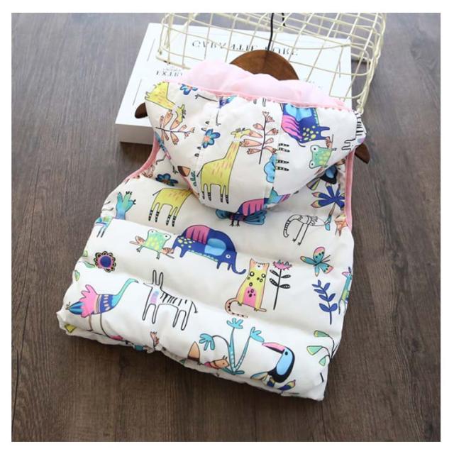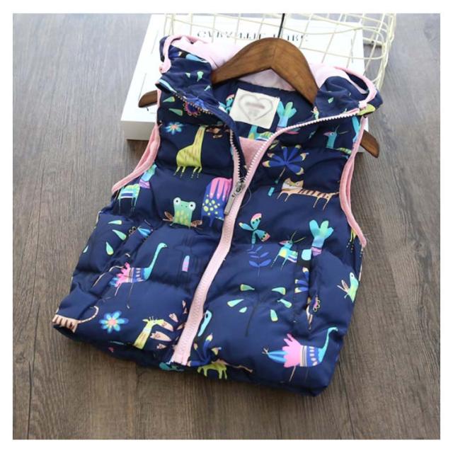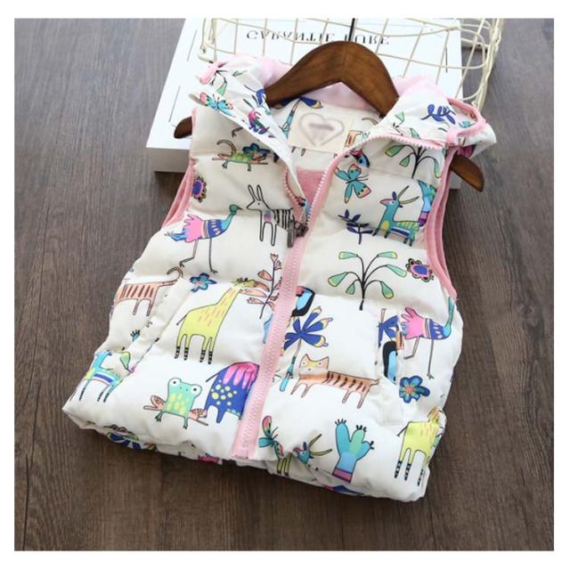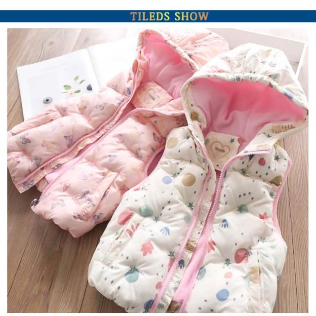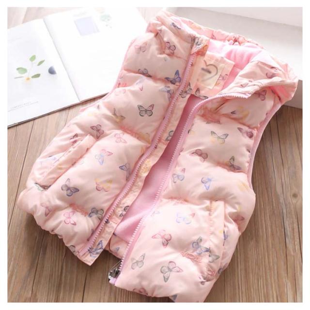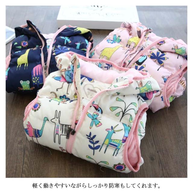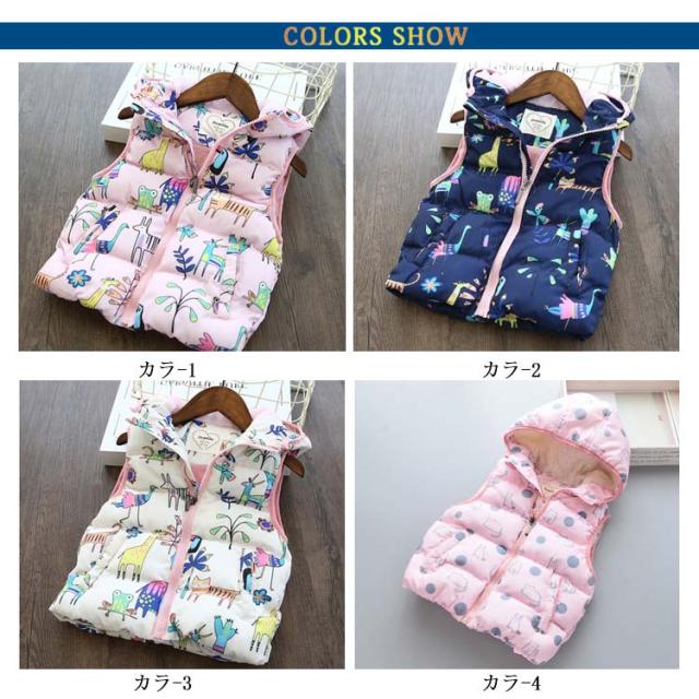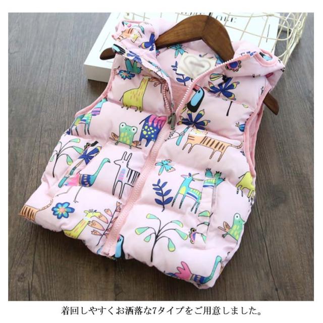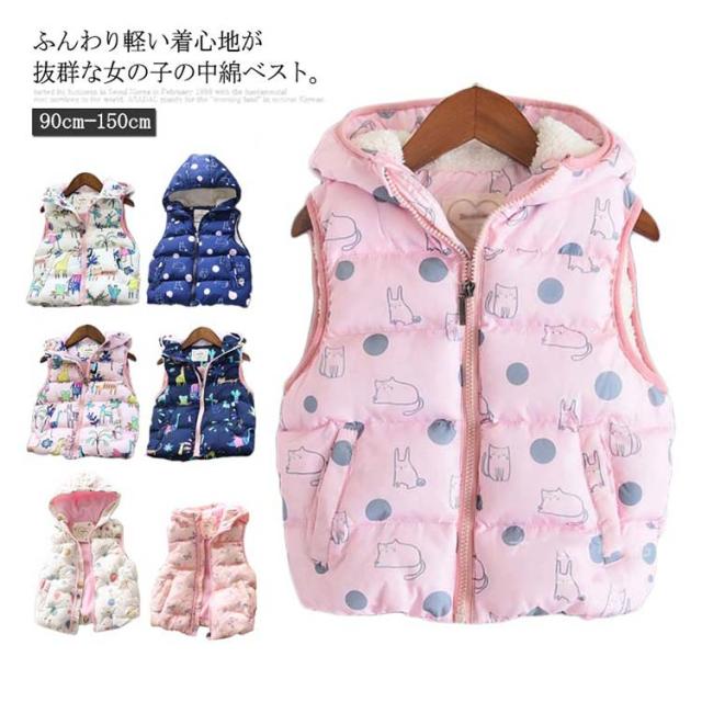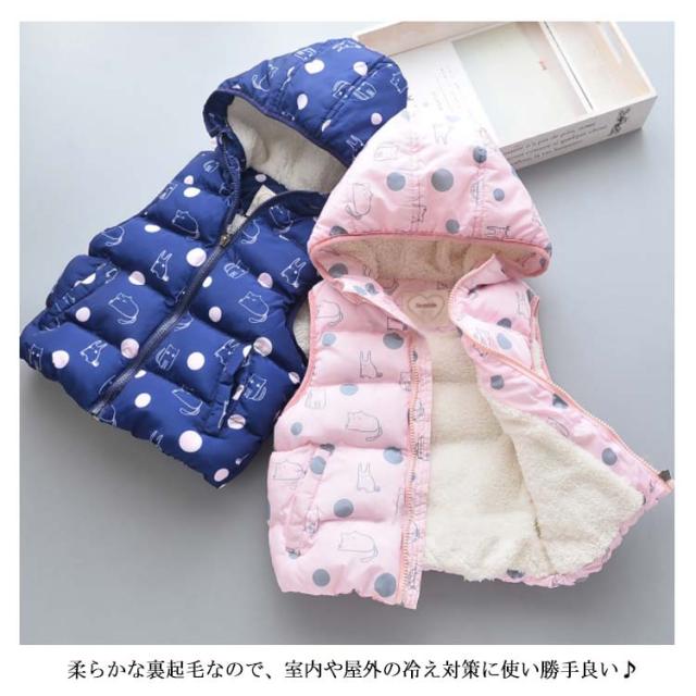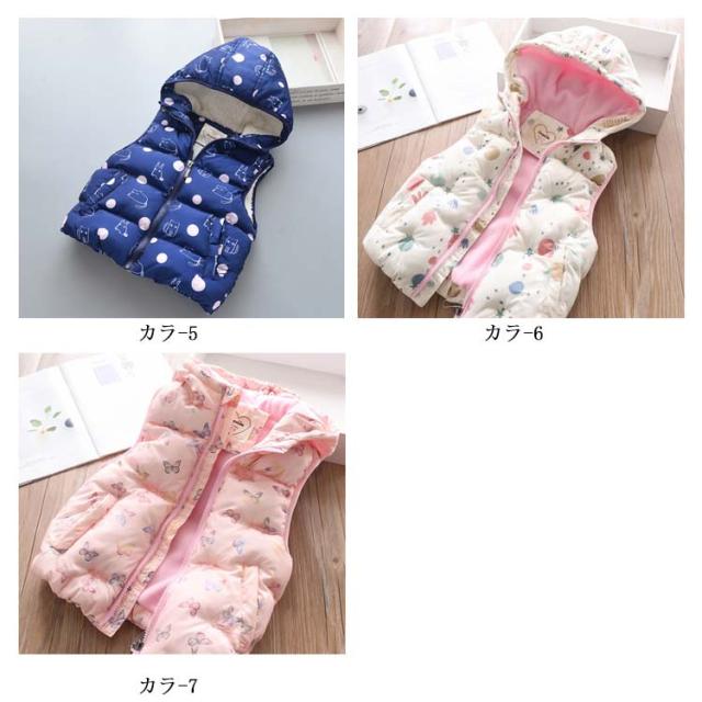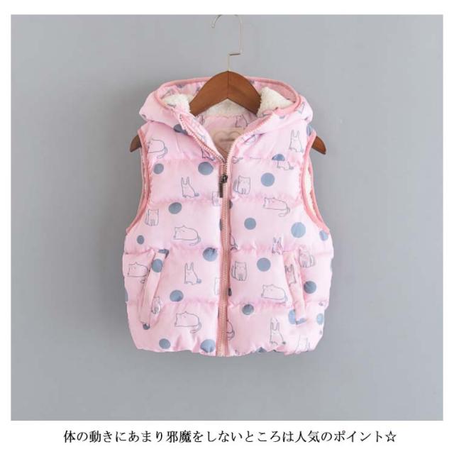 中綿ベスト キッズ服 ベスト 子供服 女の子 フード付き 裏ボア プリント 裏起毛 チョッキ トップス 秋冬 厚手 防寒保温 可愛い 90cm 100cm 110cm 110cm 120cm 130cm 140cm 150cm 送料無料