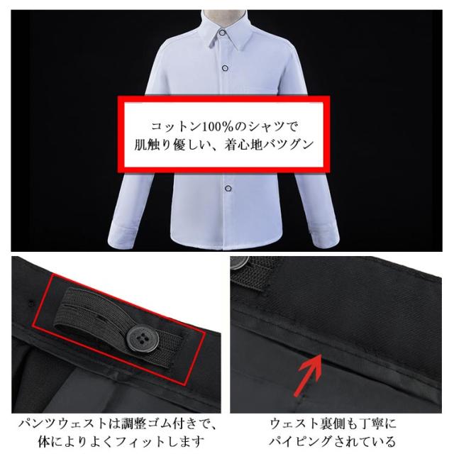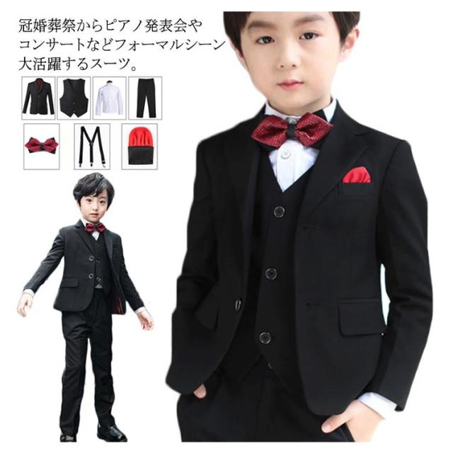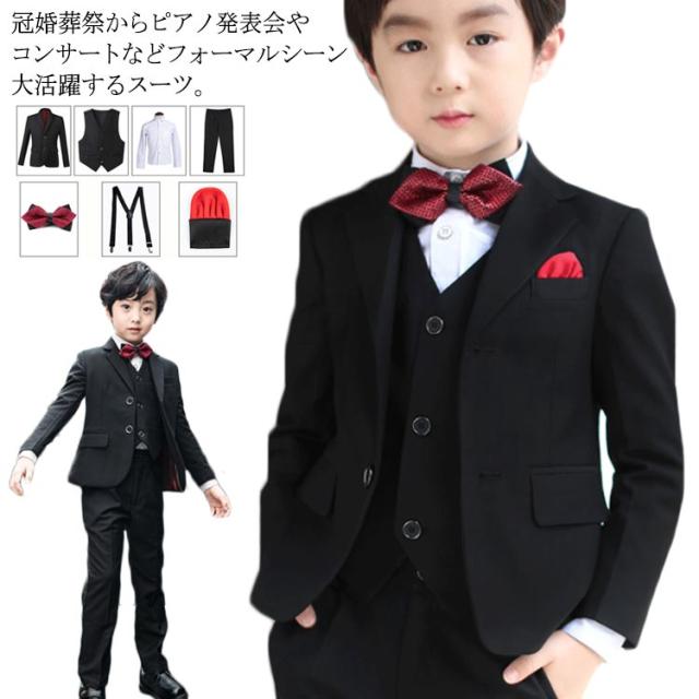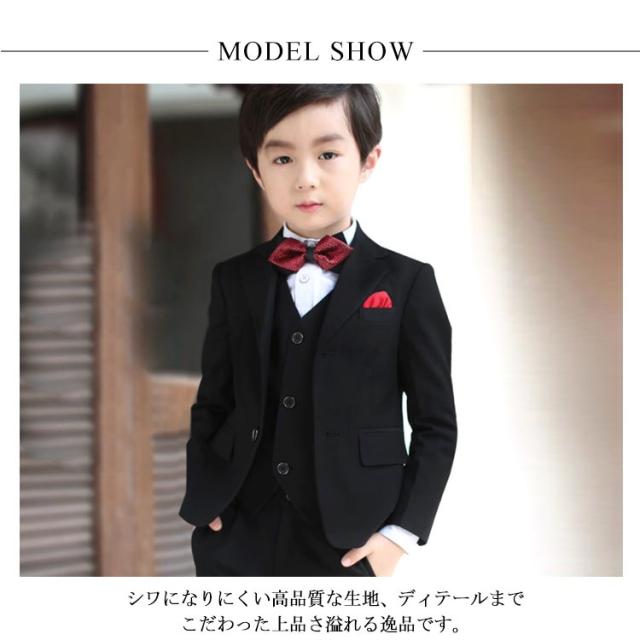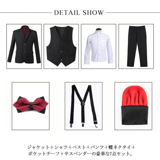 | 冠婚葬祭からピアノ発表会やコンサートなどフォーマルシーン大活躍するスーツ。 トレンドのスリムタイプだけでなく、体型の大きい子のために、ゆるめタイプもご用意しました。 ジャケット+シャツ+ベスト+パンツ+蝶ネクタイ+ポケットチーフ+サスペンダーの豪華な7点セット。 結婚式、入卒式はもちろん、発表会や七五三などシーンにもぴったり大人顔負けのデザイン。 シワになりにくい高品質な生地、ディテールまでこだわった上品さ溢れる逸品です。 | |