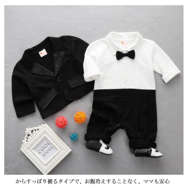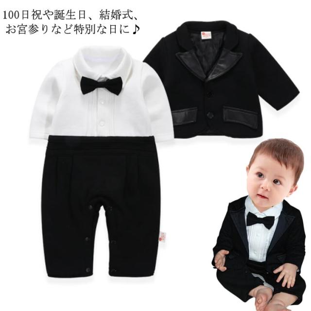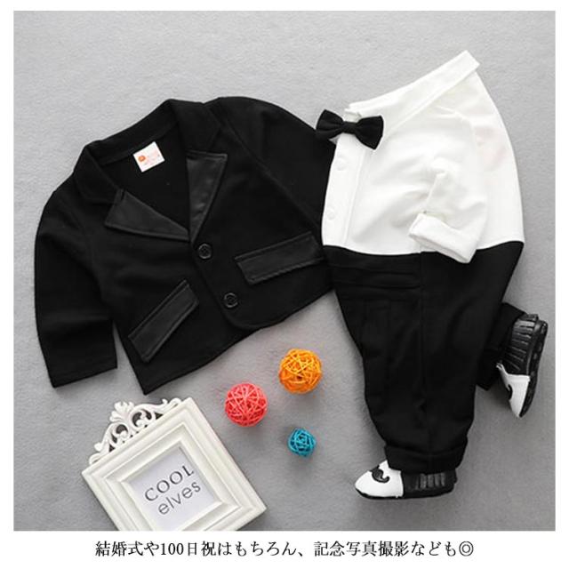 2点セット ベビー服 タキシード ベビー スーツ フォーマル 男の子 新生児 カバーオール 長袖 春 秋 コットン ロンパース お披露目 晴れ着 赤ちゃん 蝶ネクタイ ベスト 100日祝 紳士風 出産祝い お宮参り 結婚式 セレモニー 七五三 記念日 3ヶ月 6ヶ月 1歳