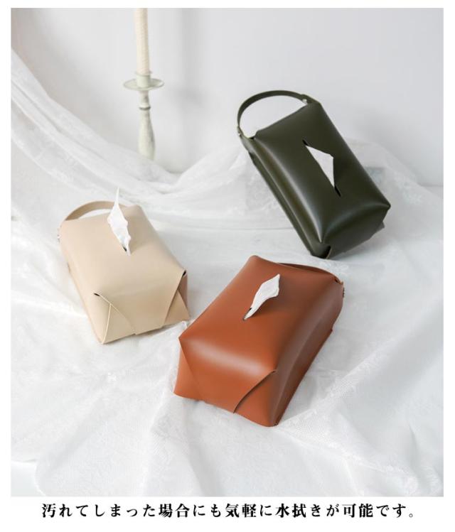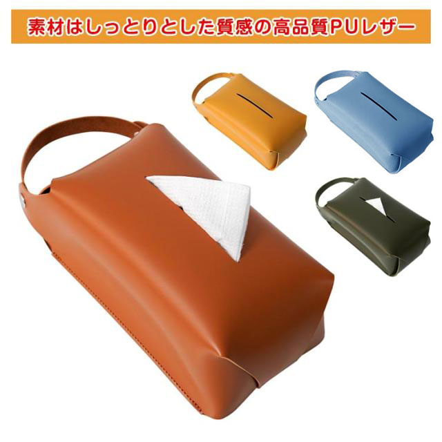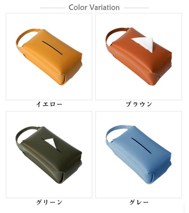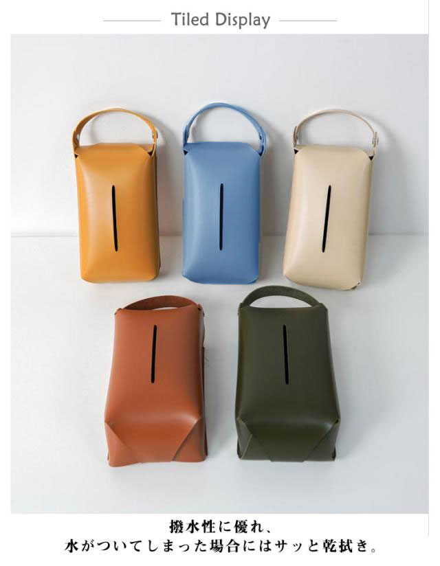 | 素材はしっとりとした質感の高品質PUレザー。 撥水性に優れ、水がついてしまった場合にはサッと乾拭き。 汚れてしまった場合にも気軽に水拭きが可能です。 水や汚れに強く、場所を取らないこのケースなら どんな場所でもティッシュを置くことができます。 強度が必要なストラップには丈夫な本革イタリアンレザーを使用。 吊り下げっぱなしでも安心して、長くご愛用いただけます。 | |