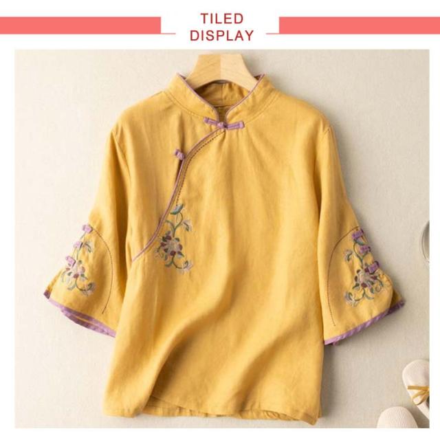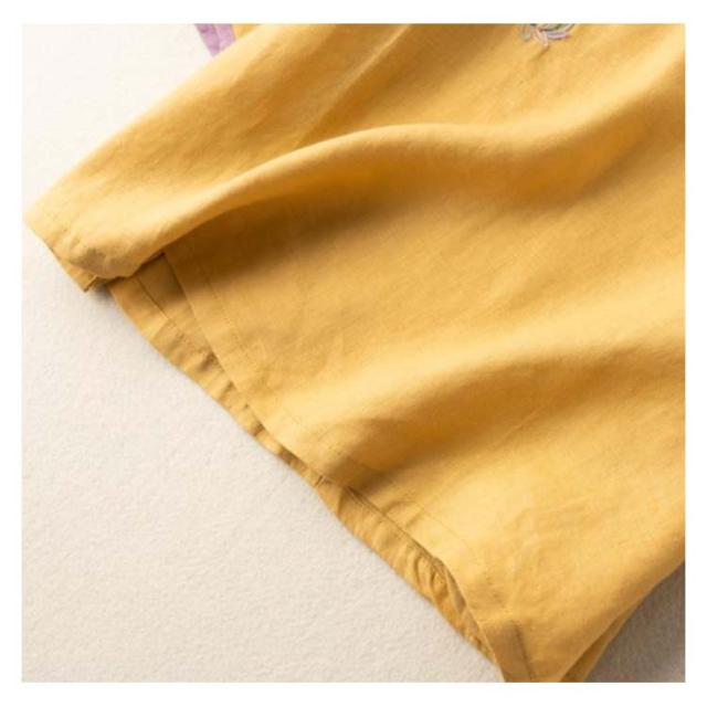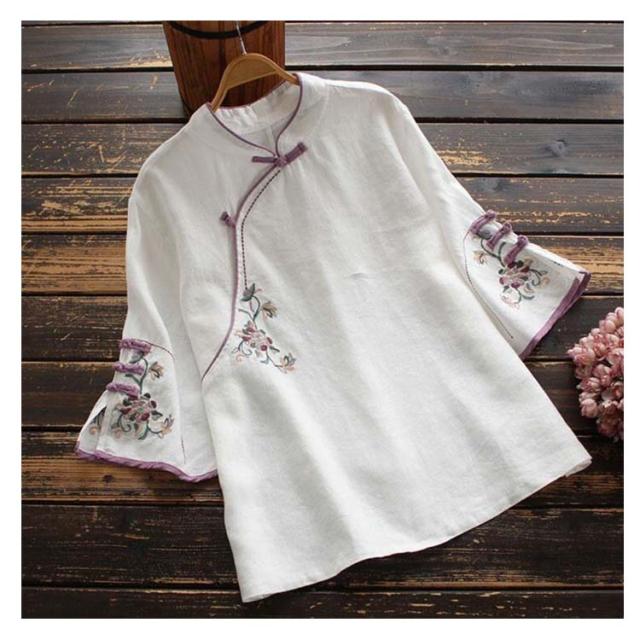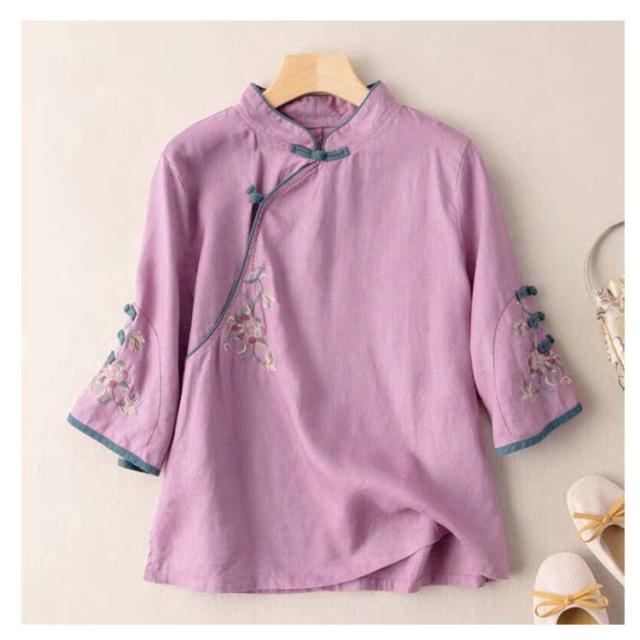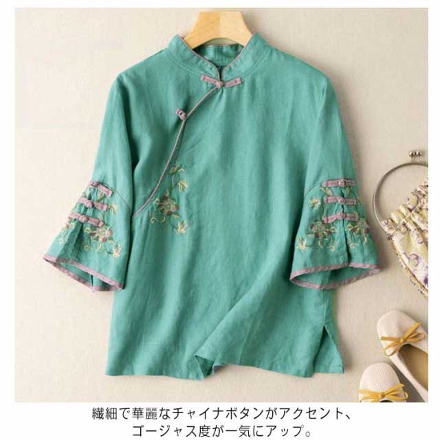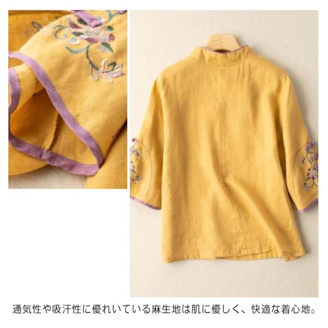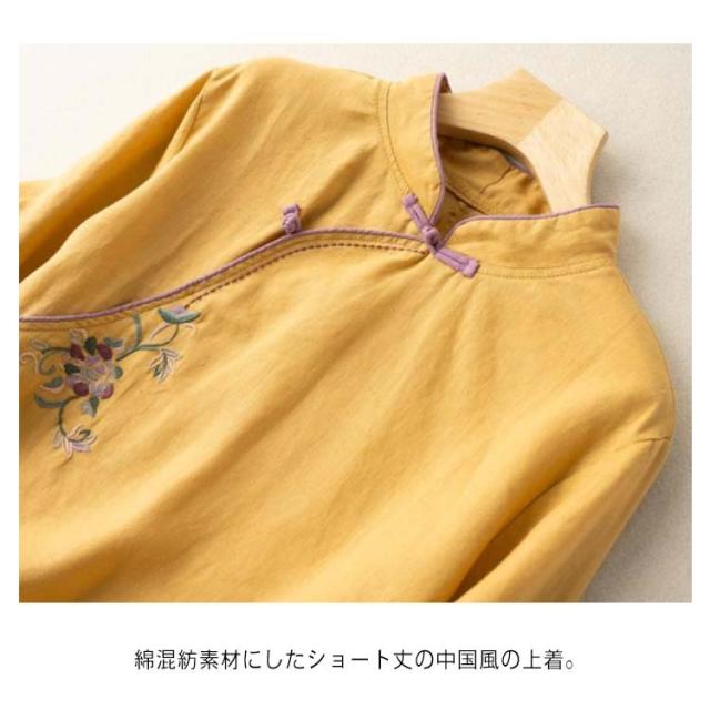 ナチュラル 春物 チャイナシャツ 中国風 花柄 チャイナ風 麻 プルオーバー チャイナカラー 綿 レディース リネンブラウス 薄手 チャイナボタン チャイナ 長袖 大きいサイズ トップス カジュアル ブラウス