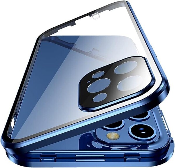 iPhone 15 Pro 用 ケース 全面カバー ロック機能付き+マグネット式 両面クリア強化ガラス 安全ロック カメラ保護 アルミバンパー アイフォン15 Pro用 ガラスケース 両面ケース 透明, 深ブルー