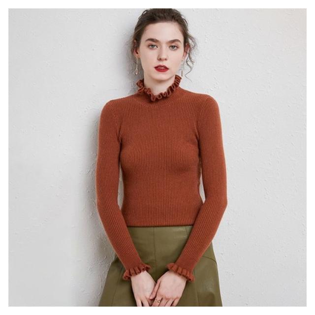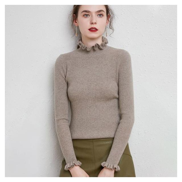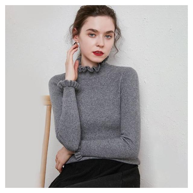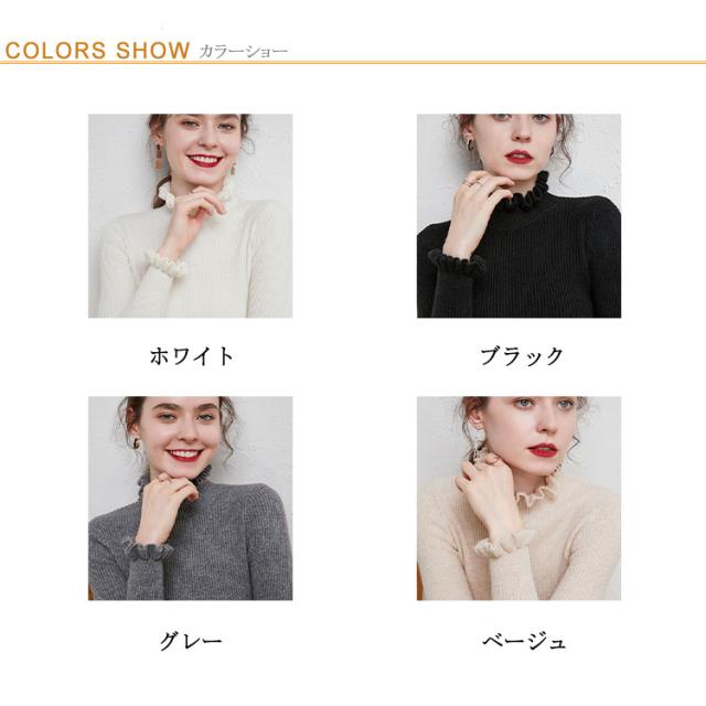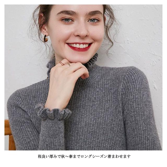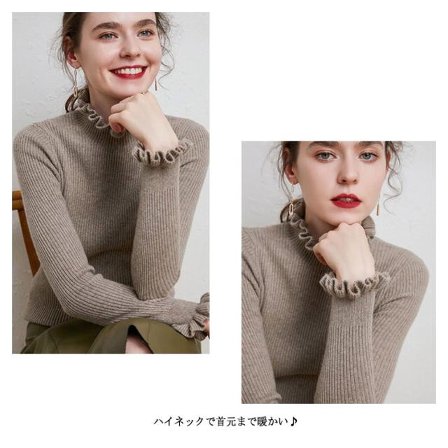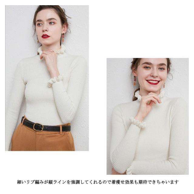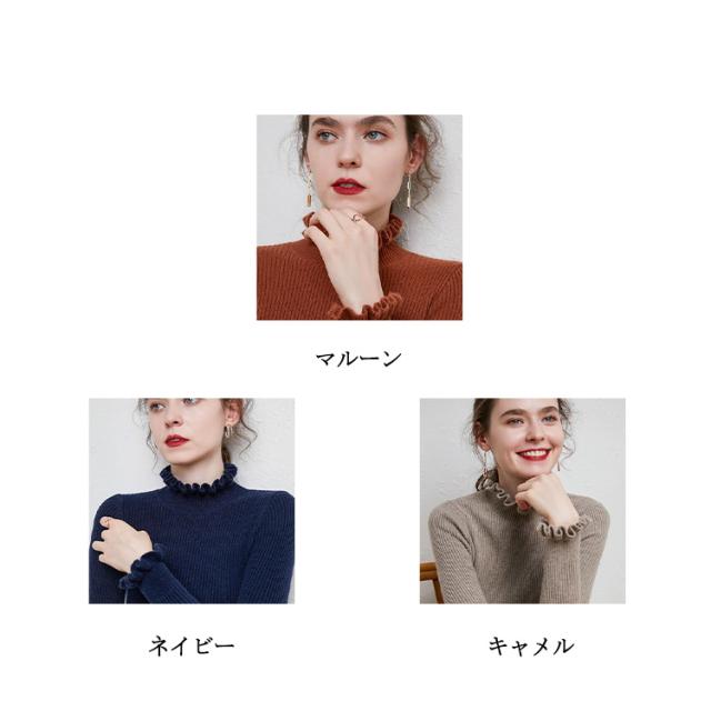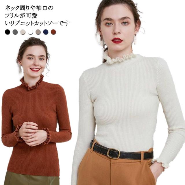 ニット カットソー リブニット プルオーバー トップス ニットセーター 長袖 ハイネック 襟フリル 袖フリル フィット 着痩せ 細身 タイト インナー 暖か 大きいサイズ 大人 無地 シンプル カジュアル きれいめ おしゃれ