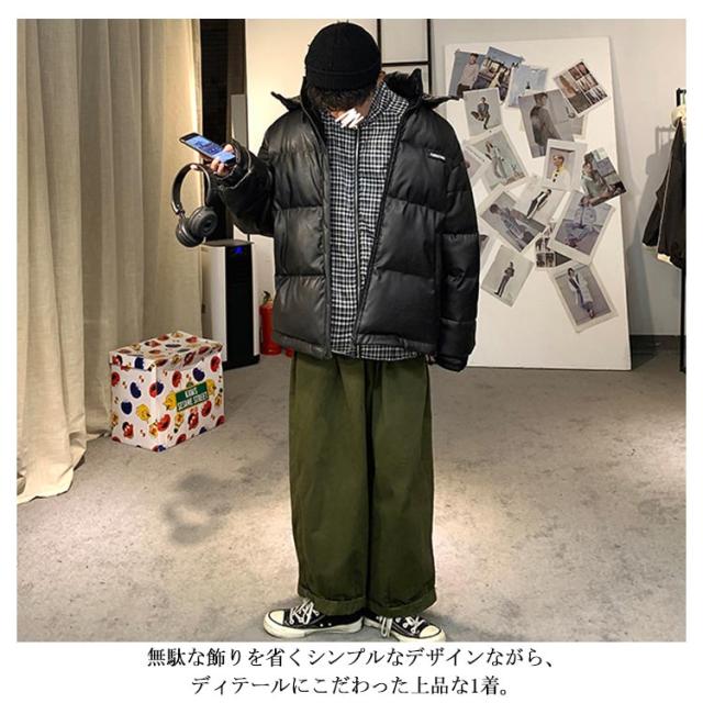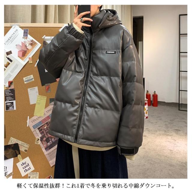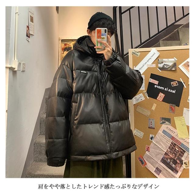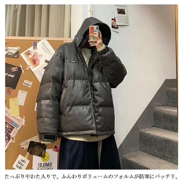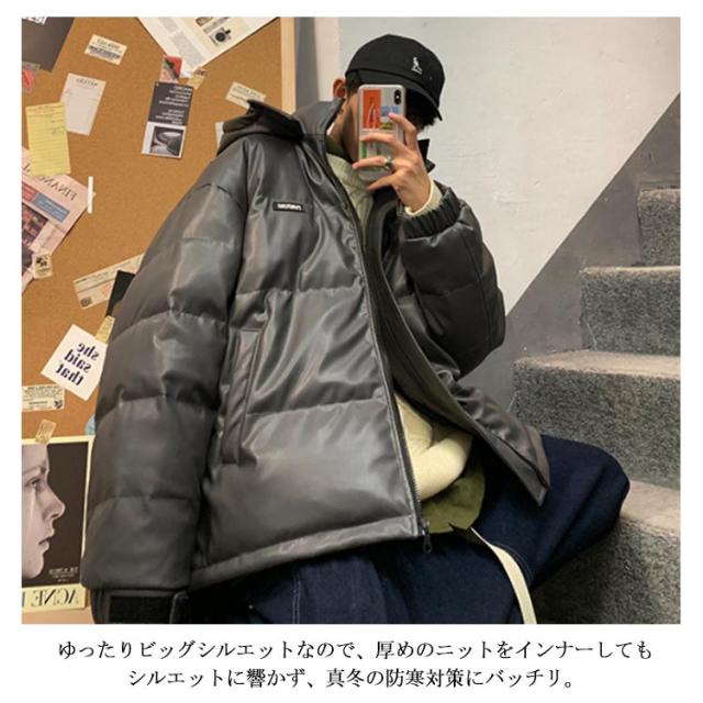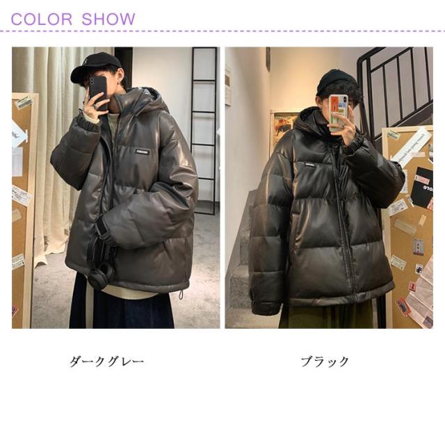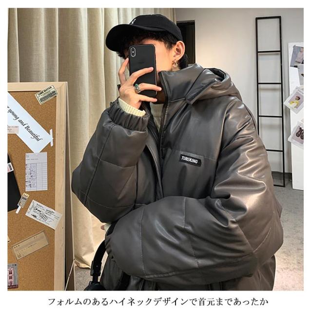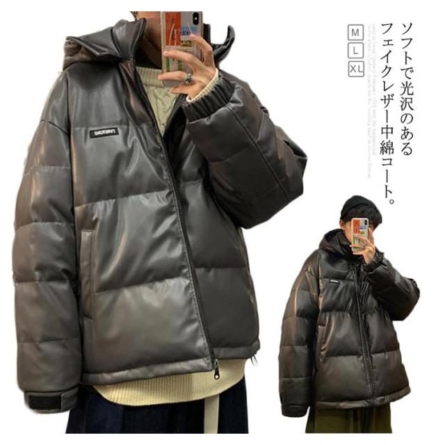 レザー コート ダウンコート 中綿ジャケット メンズ 柔らかい フェイクレザー アウター ビッグサイズ ダウンジャケット フード付き ジャンパー PUレザー 合皮ジャケット 防寒着 冬 冬物 大きいサイズ