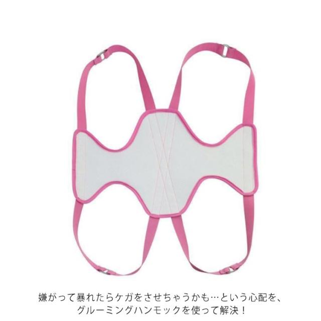 | 嫌がって暴れるペットの自宅ケアに! 爪切り、トリミング、歯みがき、目薬・服薬など、わんちゃんが嫌がる自宅ケア。 嫌がって暴れたらケガをさせちゃうかも…という心配を、グルーミングハンモックを使って解決! 身体を安定させるから安心安全! ハンモックで身体を包み込み安定させ、身体全体をしっかり支えてあげることで、 抱っこされているような安心感に、わんちゃんも暴れず安全に自宅ケアをすることができます。 嫌がるわんちゃんを無理やり押さえつける必要もなく、わんちゃんも飼い主さんも負担を減らせて、 ストレスなくお世話ができます。 使い方簡単!吊るすだけ! 設置は簡単!付属のS字フックをハンモックの穴に通して吊るすだけ! わんちゃんの身体の大きさや用途に合わせてご使用下さい。 | |