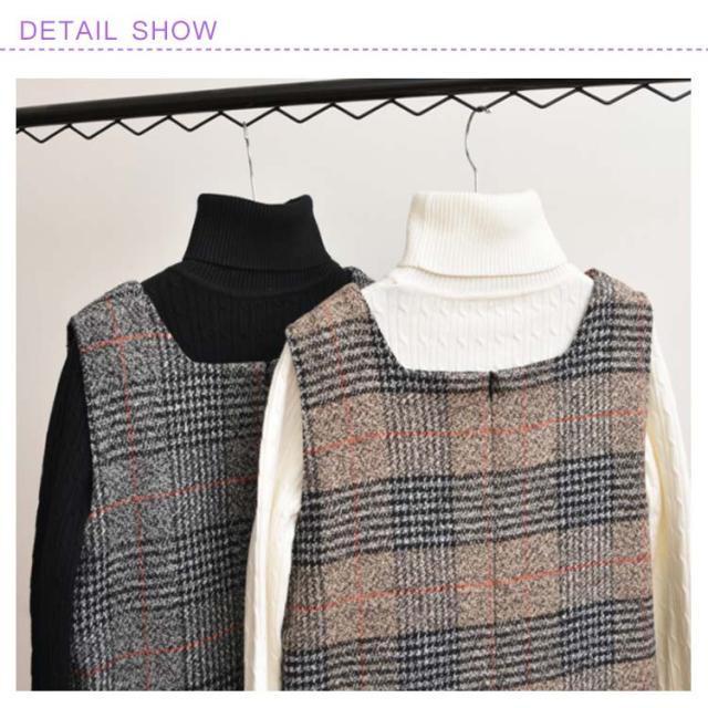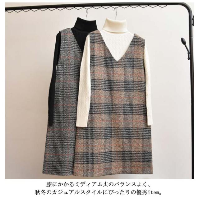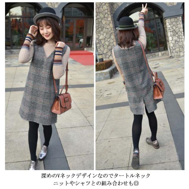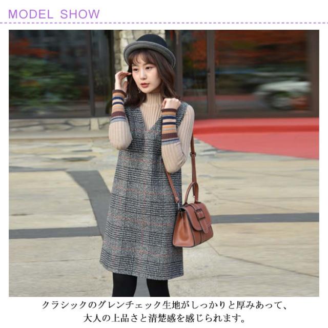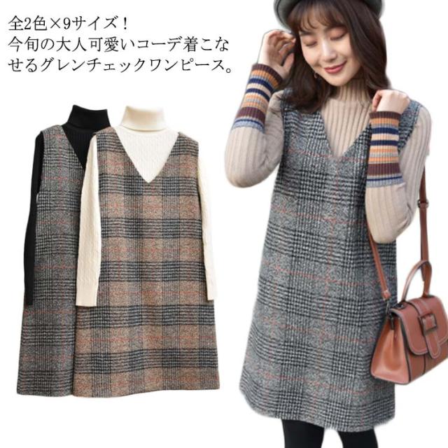 全2色×9サイズ!ワンピース 秋冬 グレンチェックワンピース ノースリーブ チェックワンピース ジャンパースカート 膝丈 ミドル丈 Vネック 大きサイズ レイヤード カジュアル 秋 冬