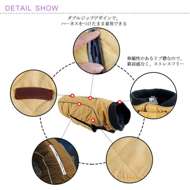 | ディテールにこだわったキルティングコート。 お腹の部分はシャーリングゴムでほどよくフィットし、保温倍増。 リードやハーネスをつけたまま着れるようにホールやファスナーが配置されます。 さらに、反射材付きで、夜のお出かけやお散歩も安心。 | |