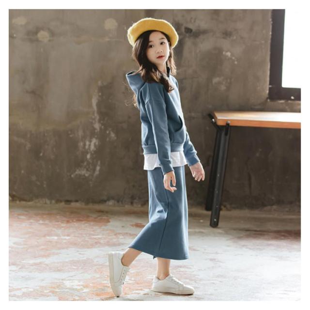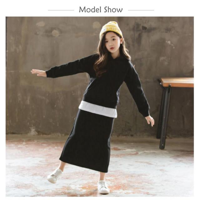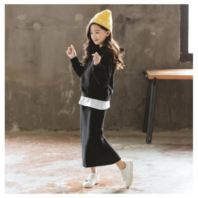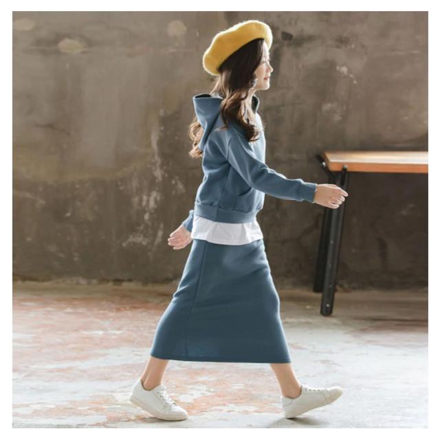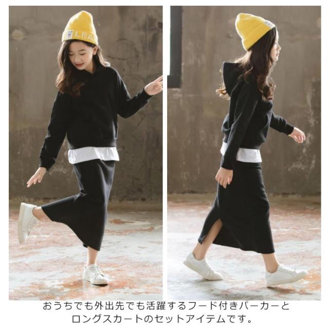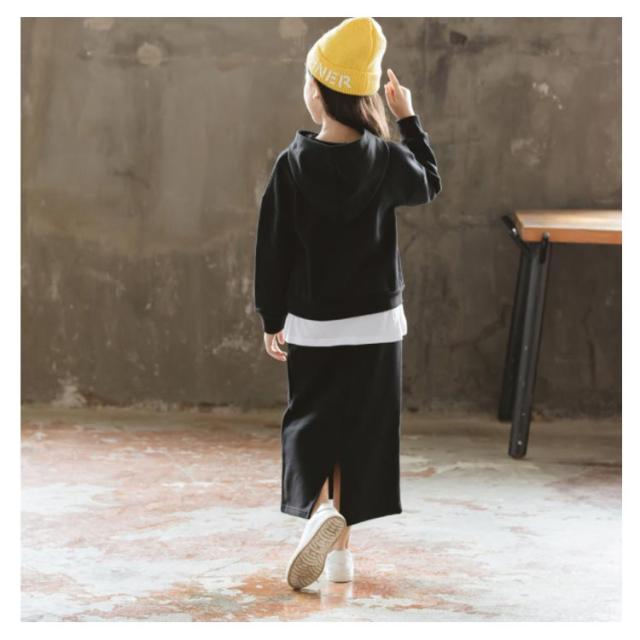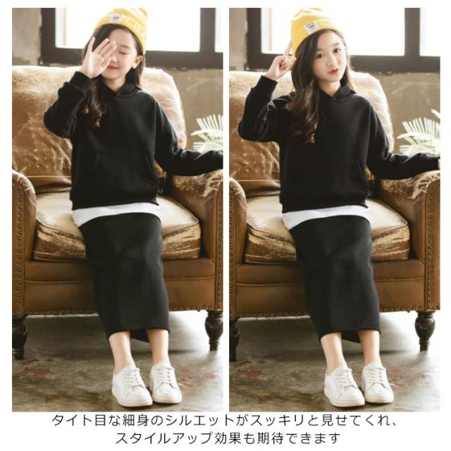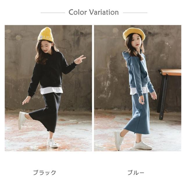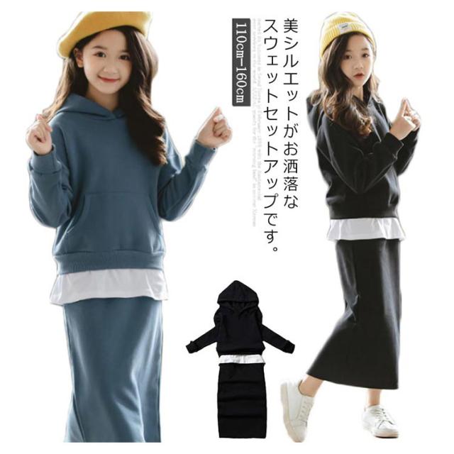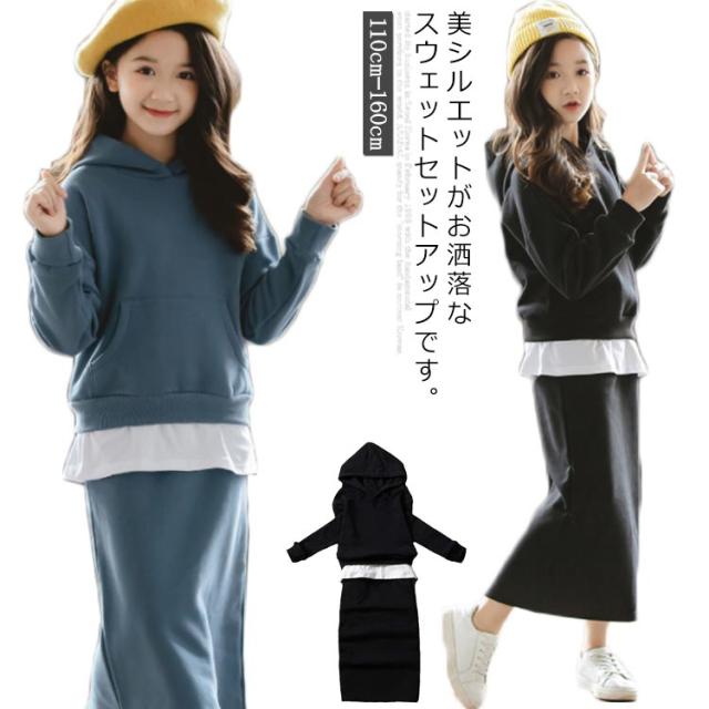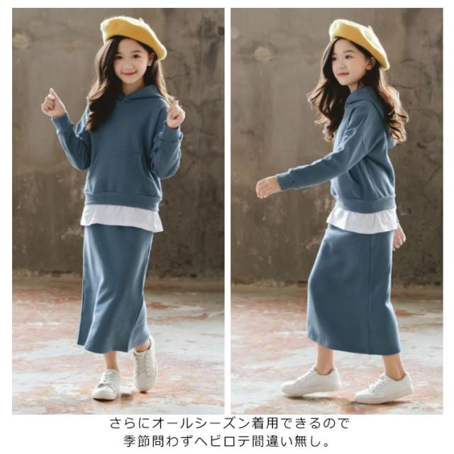 子供服 パーカー スカート 2点セット フード付き タイトスカート 上下セット ペンシルスカート ウエストゴム 重ね着風パーカー チュニック おしゃれ 新作
