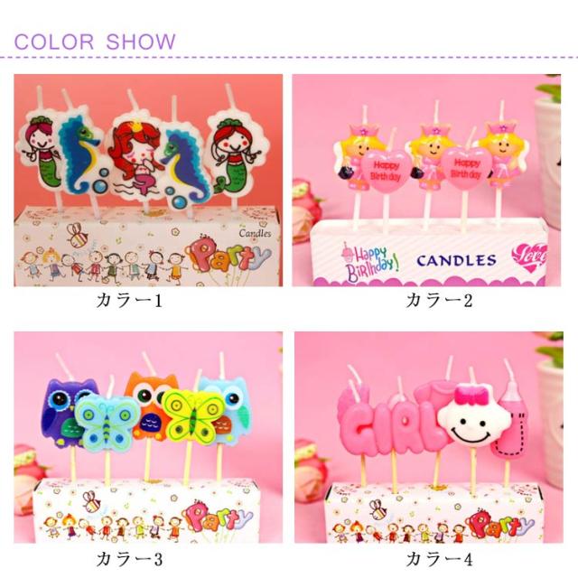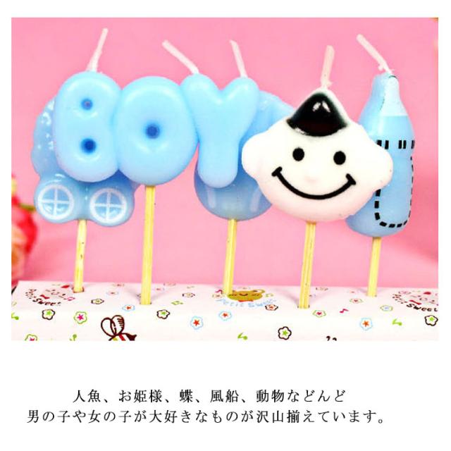 | 20タイプもあり、お好みに合わせて選べる放題! 火をつけるともったいない程カワイイバースデーキャンドル。 記憶に残る誕生日を簡単に出来上がる♪ 人魚、お姫様、蝶、魔女、風船、動物などんど男の子や女の子が大好きなものが沢山揃えています。 可愛いロウソクは誕生日ケーキのデコレーションにピッタリ。 birthday GIRLとMy 1st Birthdayは画像通り、5本ではなく、1本のみです。 お子様や友達、恋人など大切な人と楽しい時間を過ごしましょう。 お祝いに、パーティーに、イベントに♪ | |