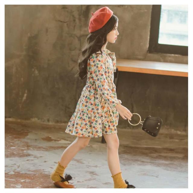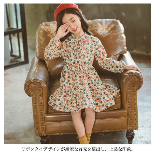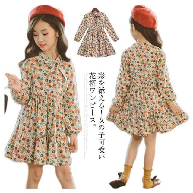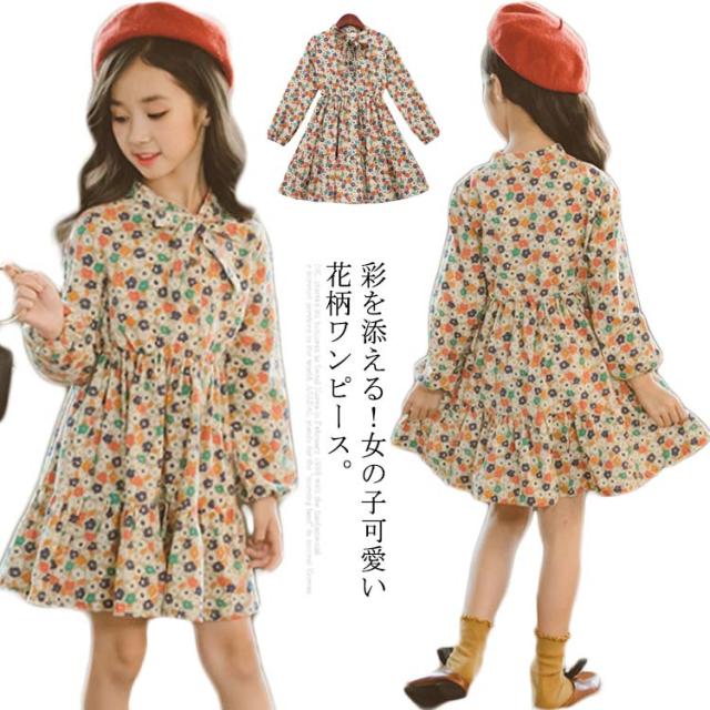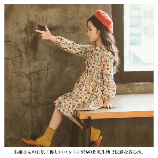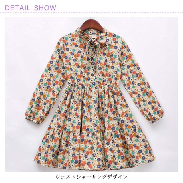 | 彩を添える!女の子可愛い花柄ワンピース。 リボンタイデザインが綺麗な首元を演出し、上品な印象。 お嬢さんのお肌に優しいコットン95%の起毛生地で快適な着心地。 コートやカーディガンのin、コーデを彩る可愛いワンピース。 | |