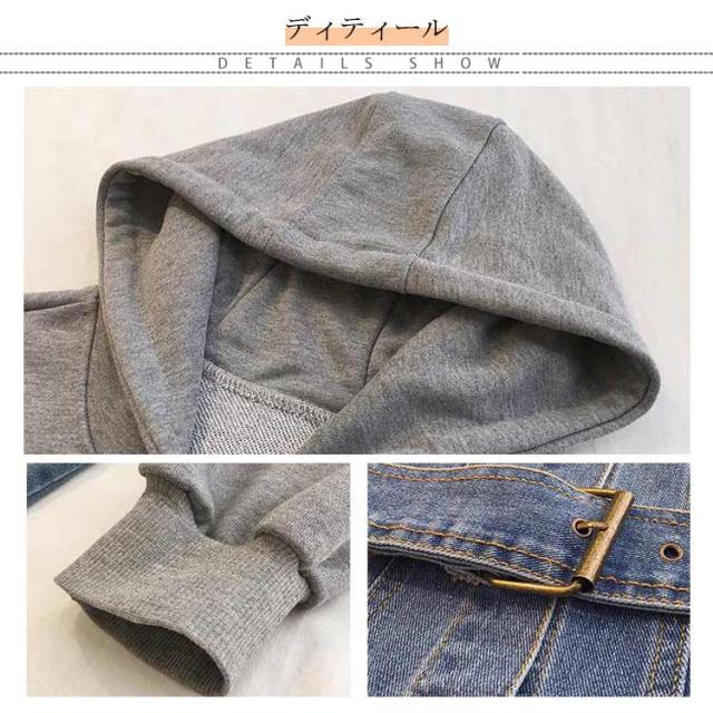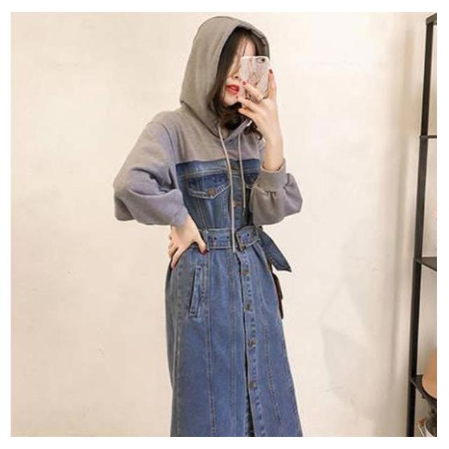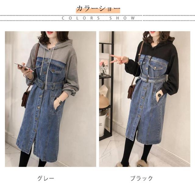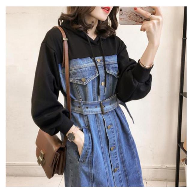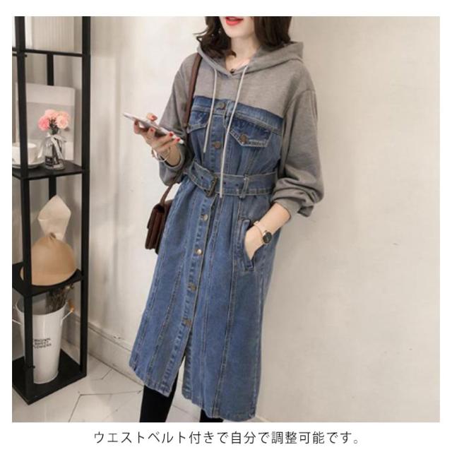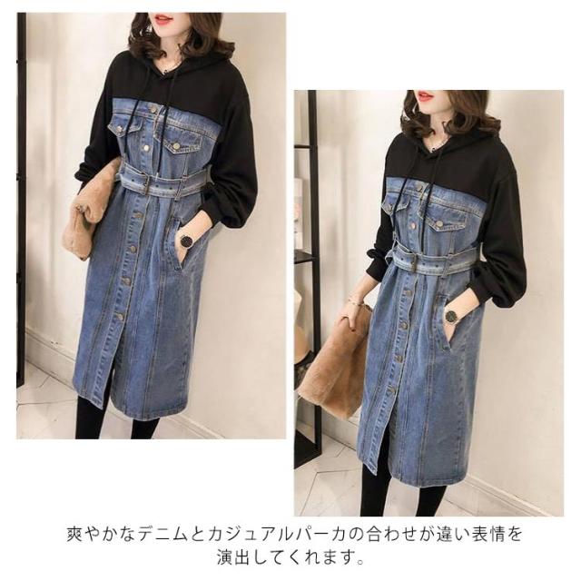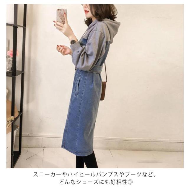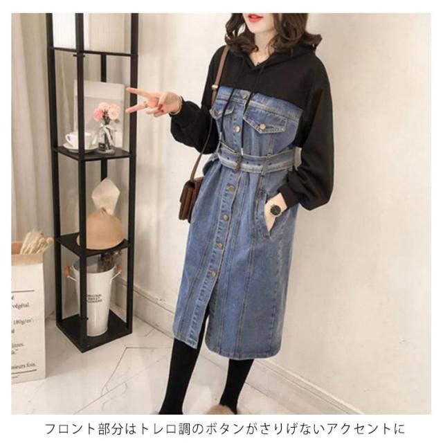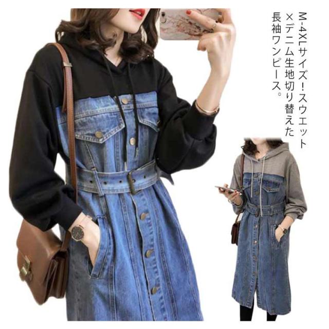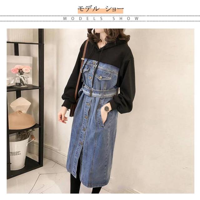 M-4XLサイズ!フェイクセット風 パーカーワンピース デニムワンピース ミディアム ワンピース カジュアル 切り替え ドッキング 大きサイズ 春 秋 冬